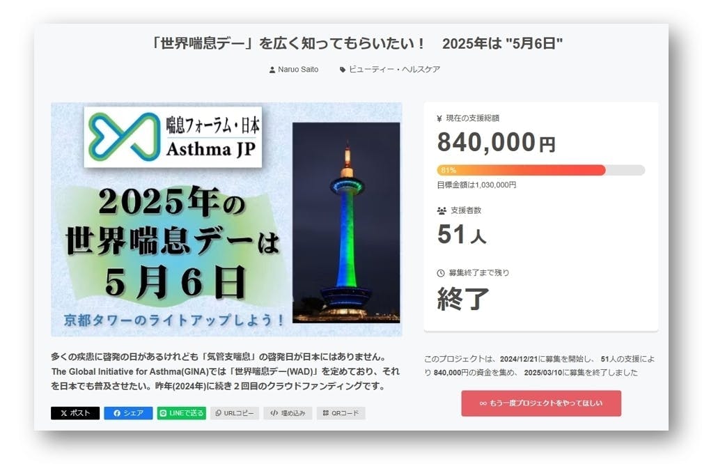 本プロジェクトはAll-in方式です。目標金額に達しませんでしたが、世界喘息デーを周知するために、2025年5月6日は京都タワーライトアップし、そしてポータルサイトやSNSに広告掲載をいたします。そして、無償やわずかな費用負担でライトアップや広報して下さるサービスや団体をこれからも探していきます。