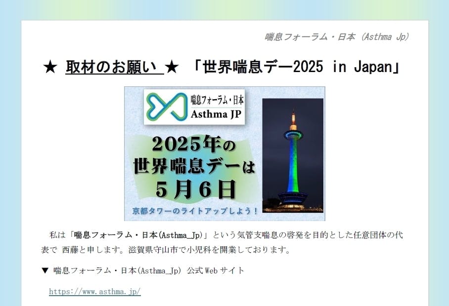 滋賀県や京都の記者クラブや、滋賀/京都の新聞社やテレビ局に、世界喘息デーの紹介と取材の依頼を発送しました。