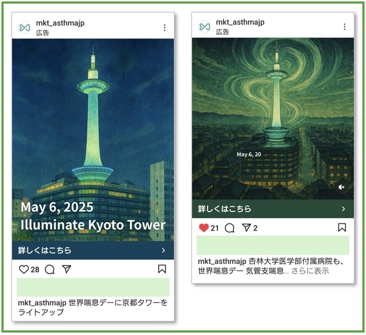 昨日(5/6,2025)、ニデック京都タワーを青と緑のライトアップをしてきました。クラウドファンディングや直接のご寄付を頂いた方々、そして気管支喘息の啓発日の確立にご協力頂いた方々に、深くお礼を申し上げます。気管支喘息への啓発カラー(青&緑)で染まったニデック京都タワーを、大勢の方が見上げながら、スマホやカメラで撮影されていました。青と緑に照らされたニデック京都タワーは、実際に見ると荘厳な塔のイメージで、写真ではその存在感をなかなか上手く伝えられない気もします。たくさんの写真を撮りましたので、後でベスト Phot を選ぶつもりですが、取り急ぎ私のスマホで撮った中で良さそうな写真を、取り急ぎご紹介します。詳しくは「喘息フォーラム・日本」の公式Webサイトでご紹介しております。ぜひ共ご覧下さい。▼ 喘息フォーラム・日本 (Asthma Jp)https://www.asthma.jp/ 画像キャプションこれからまだ各所(滋賀医科大学付属病院、宿場町平福)でも、気管支喘息への啓発が目的のライトアップが予定されています。通院される患者さんやお近くの方は、そちらもぜひご覧下さい。▽ 滋賀医科大学付属病院https://www.shiga-med.ac.jp/hospital/▽ 宿場町平福(兵庫県佐用町)http://34cho.com/kankou/shukubamachi-hirafuku/