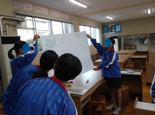 私の仕事内容や、旅館やグランピングで働く様々な役割を持った職業の人達がいることを紹介して、その後は、ワールド・カフェ(模造紙にざっくばらんに書くブレスト)の方法で皆でディスカッションします。