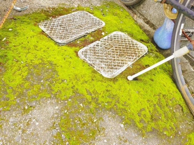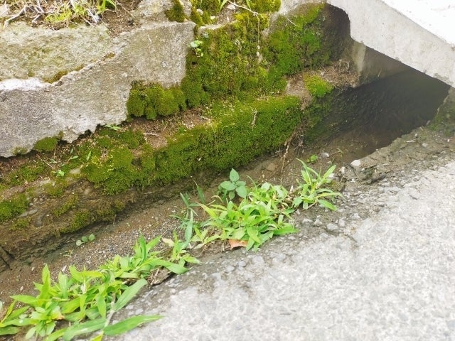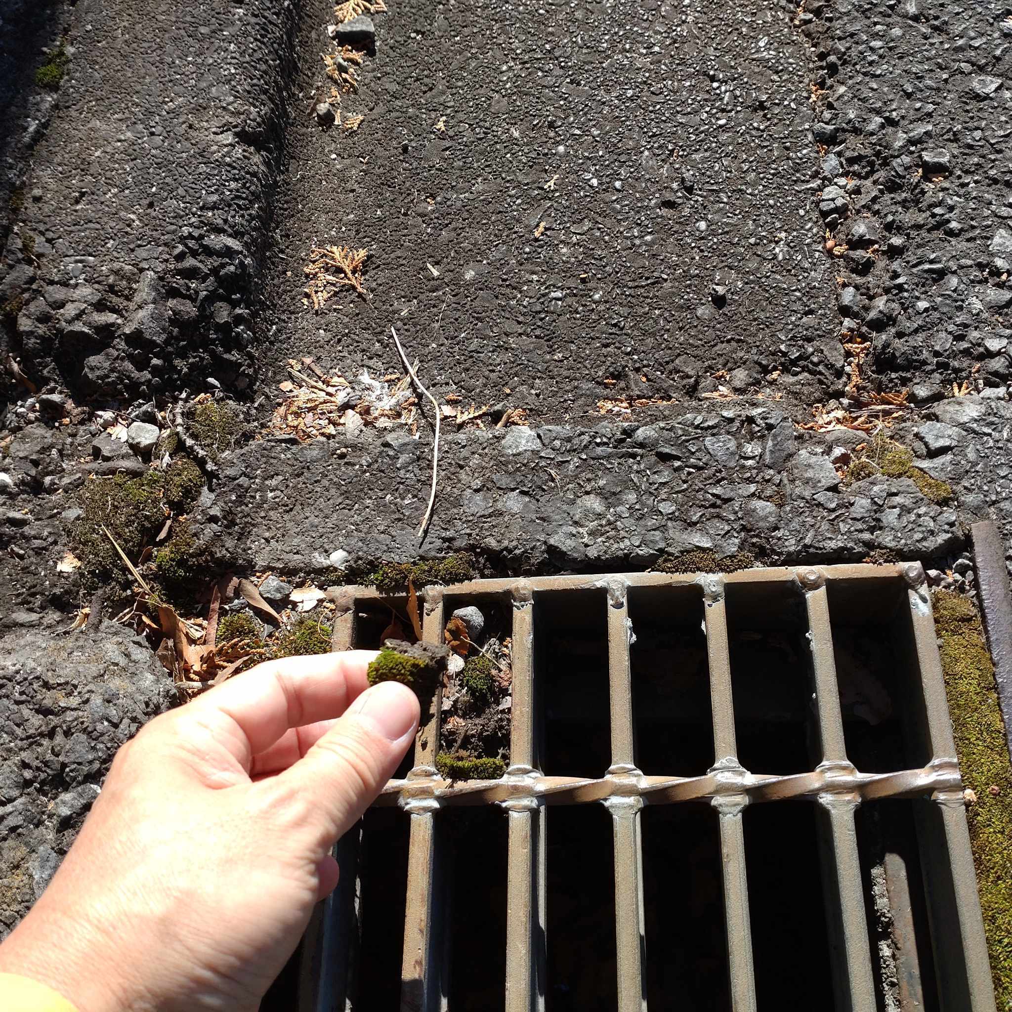 よく見ると、グレーチングの端に土が詰まっていて、そこにコケが生えています。