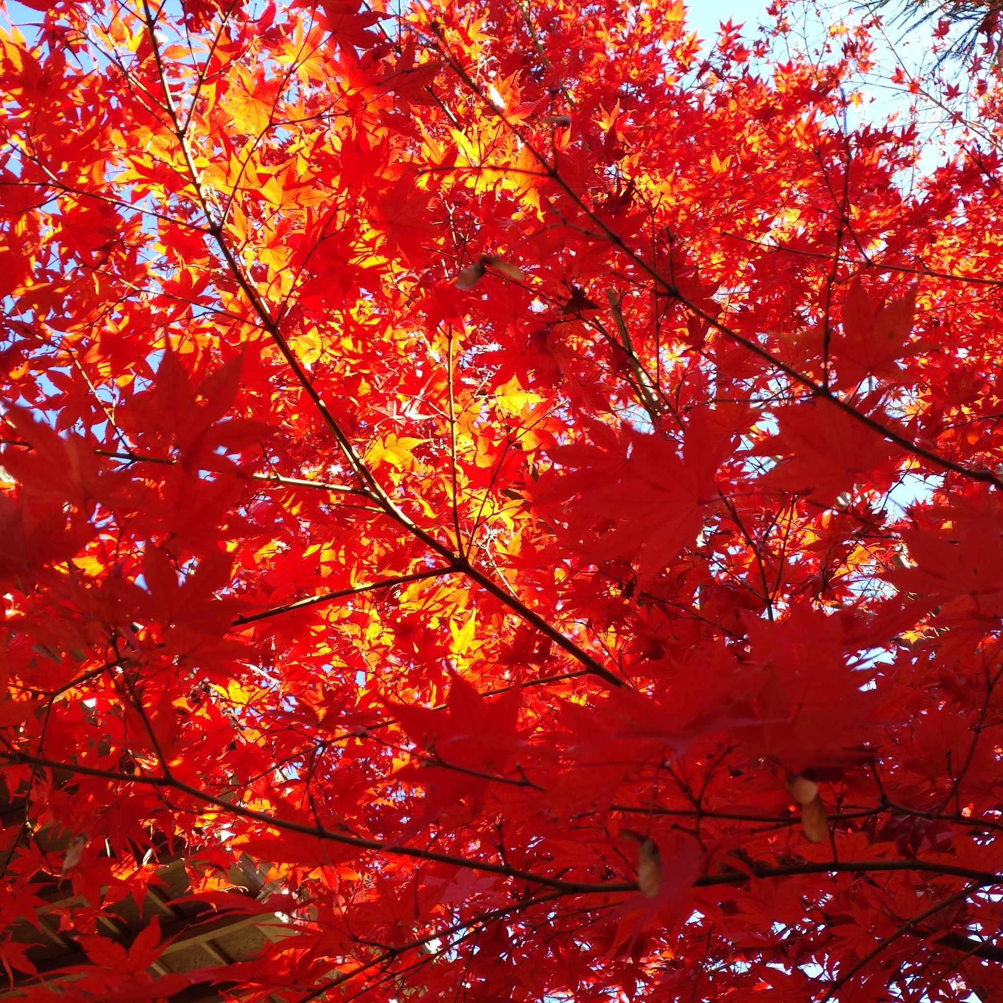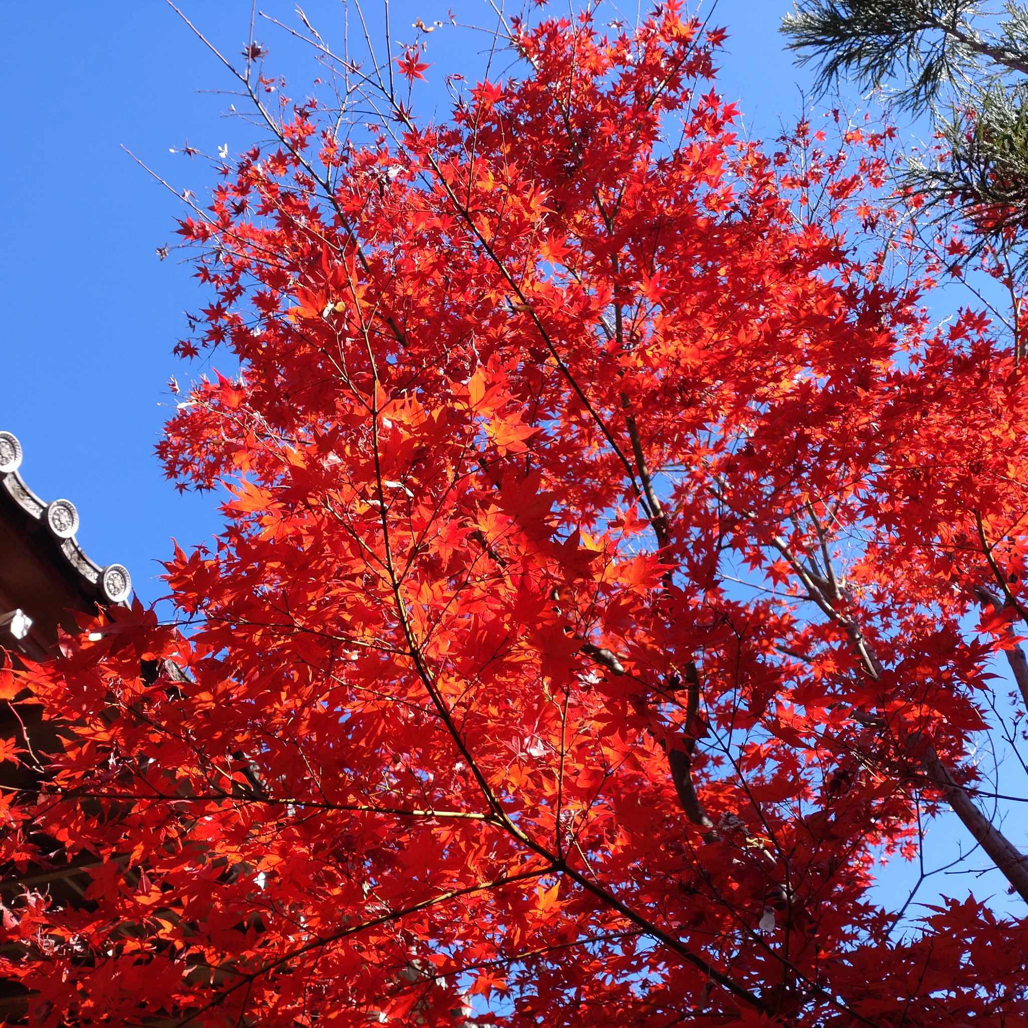 お寺の中庭です、モミジが真っ赤!!青空に映えて最高に鮮やかです!!