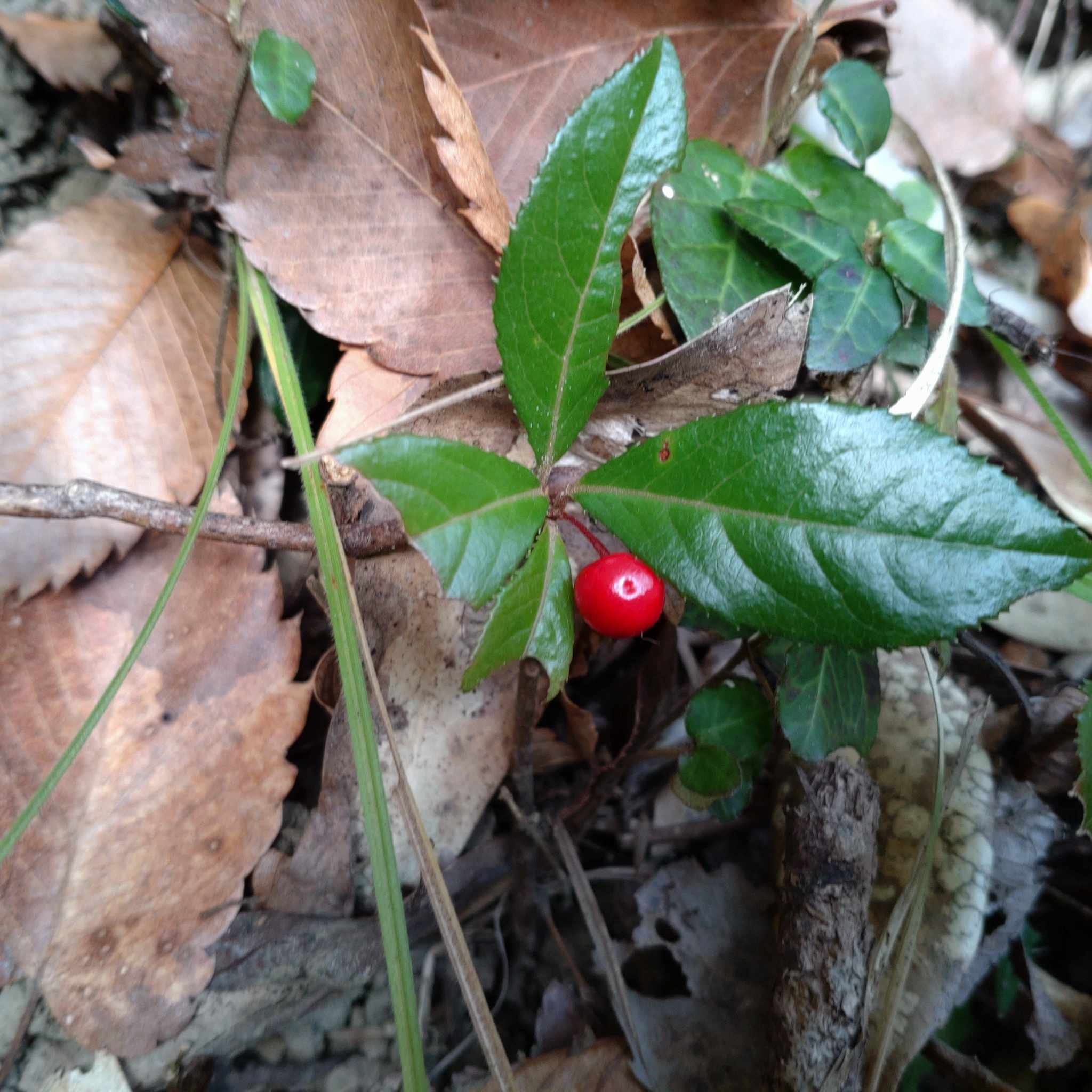 冬枯れの山に入った際には探してみてください、落ち葉だらけの茶色い地面に力強い緑の葉と赤い実が1個から数個付いているだけですが、赤い宝石のようで何だかホッとします。