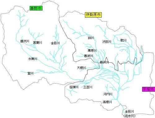 画像は神奈川県HPより引用、なんと金目川水系は生態系も豊かで上流にはいくつもの支流があるではありませんか!!