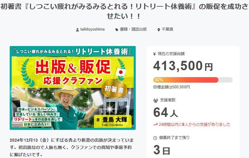 早いもので明日でプロジェクト終了になります、そして、いよいよ明日が本書の出版日です!!これまで、ご支援くださった方には本当に感謝いたします。また、これから支援をしようと思っておられた方は、明日で締め切りになりますから早めにお申し込み頂けたら嬉しいです。プロジェクト達成まで、本当にもう少しといったところまで来ています!!最後の追い込みに、私が何をしていたかといいますと自分のリトリートで「寺ヨガ&坐禅会」に参加です(笑)やれるだけの事はやりました、後はジタバタせず自分のリフレッシュや健康管理を大切にしながら結果待ちといったところです。もちろん、プロジェクト終了の1分1秒まで諦めずSNSで最後の呼びかけを続けますが、一番大事なことは、繰り返しになりますが自分自身が「著書を生きる」ことだと思っています。最近の休みの日はヨガばっかりしていますが、自然は普段の仕事でどっぷり浸かっています。既に自然にいる私は自然に行くというより「リトリート=転地療法」の実践です。仕事もリトリートですから、リトリートのガイド役である私がお客様と接する時に、ストレスフルで忙しい状況でいるのと、自分自身がリトリートを実践して落ち着いた良いコンディションでいるのでは、随分とお客様への伝わり方も違うと思います。なかなか自分が主催するリトリートは、自分自身がガイド役になっているため動画や画像が少ないですが、直近で地元のケーブルテレビの取材を受けましてリトリート中の貴重な映像が残りました、ネットアプリ「どろーかる」でもご覧いただけます。「ジェイコム取材、直近のリトリートの様子」※どろーかるアプリをインストールすれば、あと1週間はご覧いただけます。3分48秒~が私の出演部分です。https://www2.myjcom.jp/special/dolocal/※エリアは千葉市、かずさ4市をご選択ください。この時は、お子様連れのご家族がご参加だったため、紅葉の時期の自然遊びが中心、途中でオカリナの演奏付きです・笑(昨日もフラダンスの皆様が泊まりにいらしていたので吹きました!)明日13日は経営者7名が、2024年の振り返りと2025年の目標設定の為の内観リトリートにいらっしゃいますので、近くの山で瞑想会を予定しております。リトリートでは訪れる方の属性(ご家族、会社の研修等)や目的によって、内容は遊び中心から内観中心など様々な調整をしています。坐禅会の前の住職の法話、このような自分自身も様々なリトリート経験をしている実体験が、自分自身が主催するリトリートに役立ちます。明日は経営者さん7名のリトリート担当です、きっと様々な重責や労苦を背負っておられる事でしょう、そんな方たちと相対するには、何より私自身が良いコンディションでいることが大切だと思います。法話の後は坐禅の時間。そして坐禅が終わった後は「明鏡止水の心境」プロジェクト終了直前で波立った湖面のようなザワザワした心が、落ち着いて鎮まって行くのが分かります。坐禅が終わったあと、その余韻に浸っていると他の参加者から、このお寺は裏庭の紅葉が綺麗だから見てくるといいよ、とアドバイスをもらって裏庭の紅葉を見に行きました。お寺の中庭です、モミジが真っ赤!!青空に映えて最高に鮮やかです!!お正月の縁起物の定番、千両(センリョウ)も、たわわに実っていました。お庭の植物としては、千両、万両が有名ですが、実は野の山にも「十両」が自生しています。冬枯れの山に入った際には探してみてください、落ち葉だらけの茶色い地面に力強い緑の葉と赤い実が1個から数個付いているだけですが、赤い宝石のようで何だかホッとします。こちらが十両です!!場所はお寺ではなく、私のお気に入りの山で撮りました。クラファンでは派手に数百万、更には数千万の支援を集めている人もいます、その人たちが千両、万両だと思うと、まるで私は十両のようだと感情移入して見えてきます。地味で目立たないけど、力強く春までずっと冬枯れの山に実を付けている十両に、何か元気をもらえます、私も自分のリトリートを繰り返しながら細く長くロングセラーを狙うぞ~。お寺の掲示板に貼ってあった住職の先輩が書いた言葉。何とこの方は死期に臨んで(何かのご病気だったようです)自ら食を断ち、坐禅を組んだまま亡くなられたとのことです。画像を撮っている私の姿が映っています、この言葉のように生きて行こうと映った自分に誓いました。必死な時には、今まで何気なく通りすぎていたような言葉が心に沁みます、これも大事なリトリート中の気づきですね。最後に、ちゃっかりヨガインストラクターさんを巻き込み本書の紹介(笑)右側の禅語「知足」が今の自分に響きます(知足=足るを知る)こうして60名以上の方に出版前に支援して頂きました、おかげ様でInstagramで出版後は当面のあいだ広告も出せそうです。プロジェクトが達成できれば、それは一番嬉しいことではありますが、とても多くの方のご支援や励ましの言葉を頂