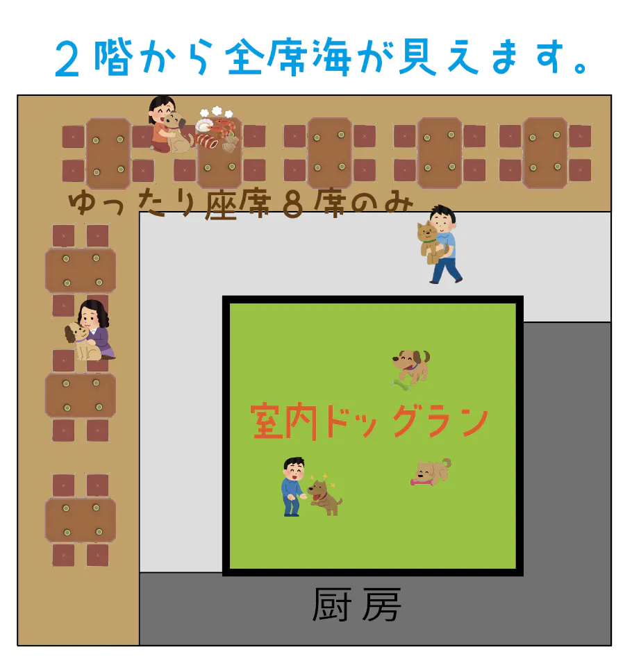 また、ペットと一緒に!という部分を大切にし、今までの浜焼きイメージのギュウギュウの席ではなく、ゆったりとスペースをとり全席から海の見える座敷席8席(もちろんペットOK)