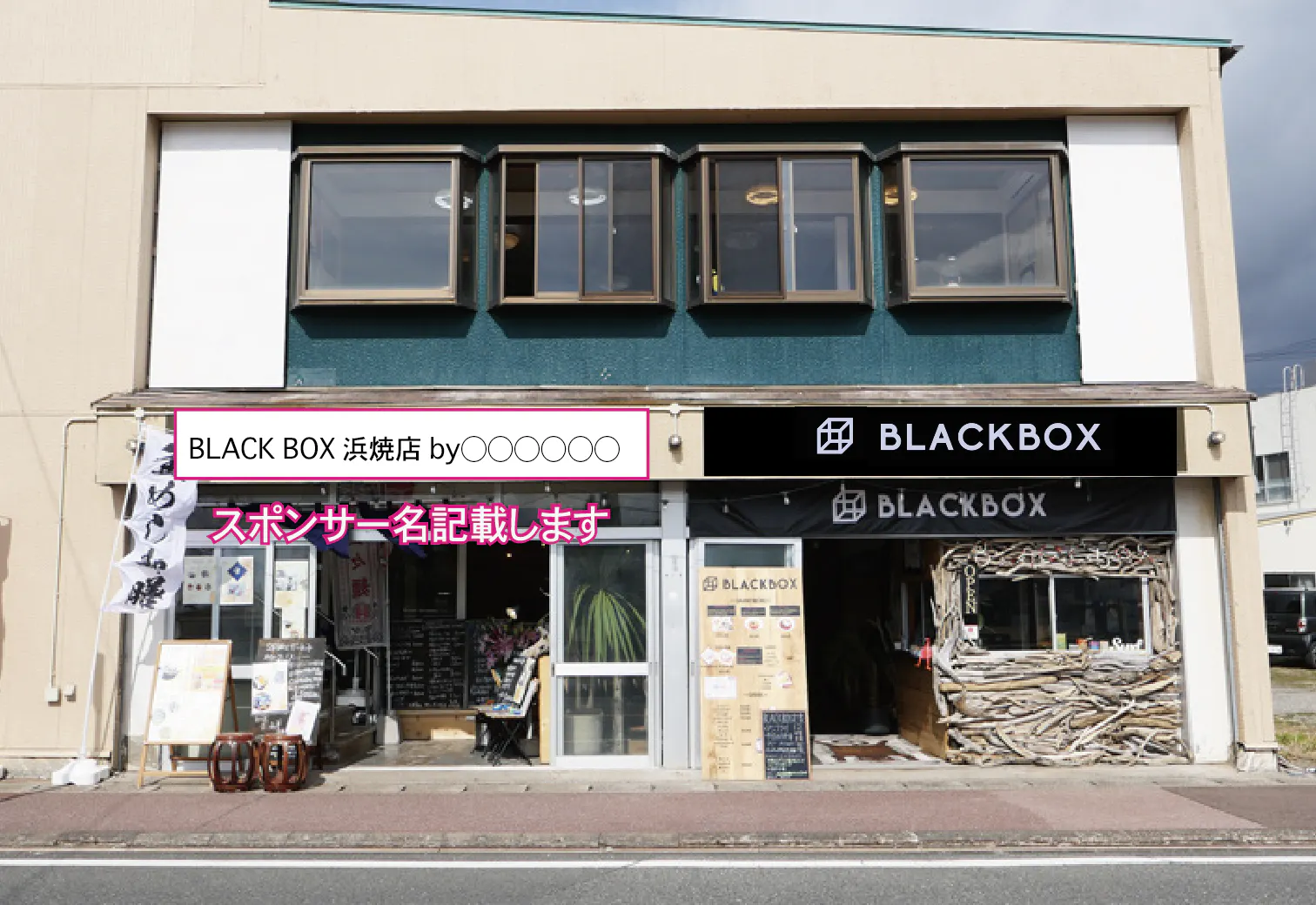 BLACK BOXは灯台観光地の玄関口で、最も目につく場所に位置しています。その看板に『BLACK BOX浜焼店 by◯◯◯◯◯◯』とスポンサー名を店名にさせていただきます。もちろん看板だけではなく