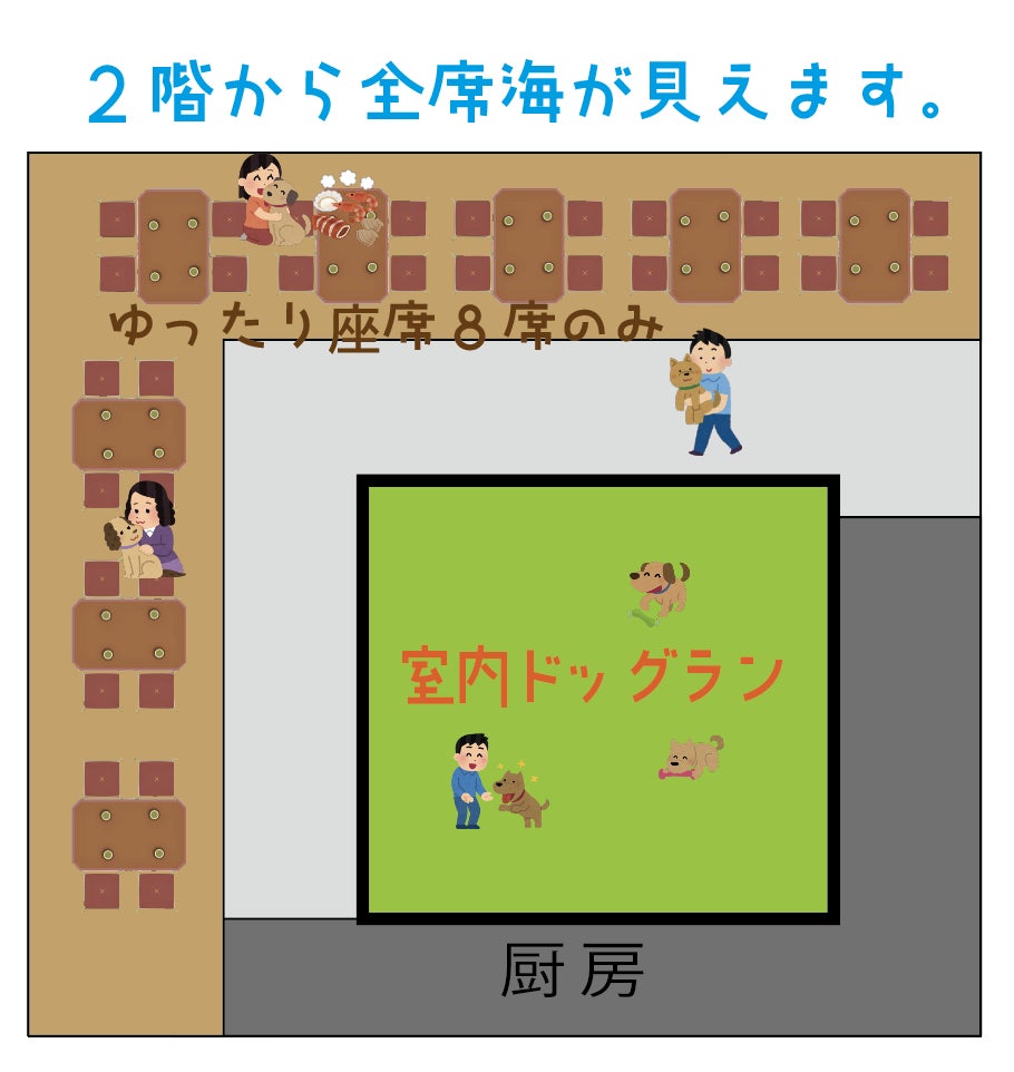 また、ペットと一緒に!という部分を大切にし、今までの浜焼きイメージのギュウギュウの席ではなく、ゆったりとスペースをとり全席から海の見える座敷席8席(もちろんペットOK)