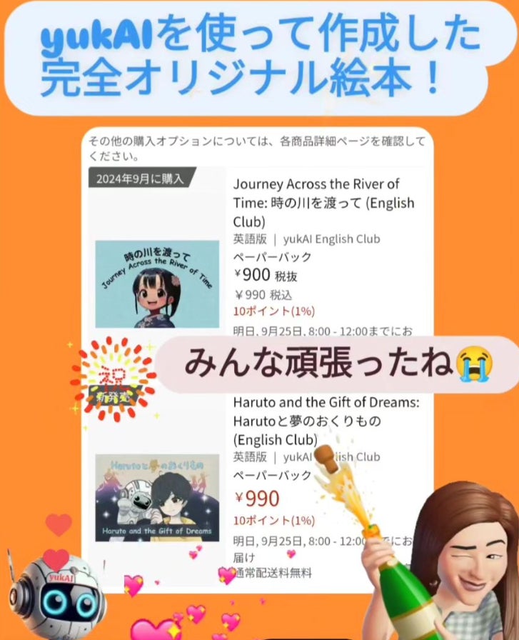 私たちが制作する絵本は、English Club代表が開発したAI神アプリ『yukAI』や、画像生成AIを駆使しています。