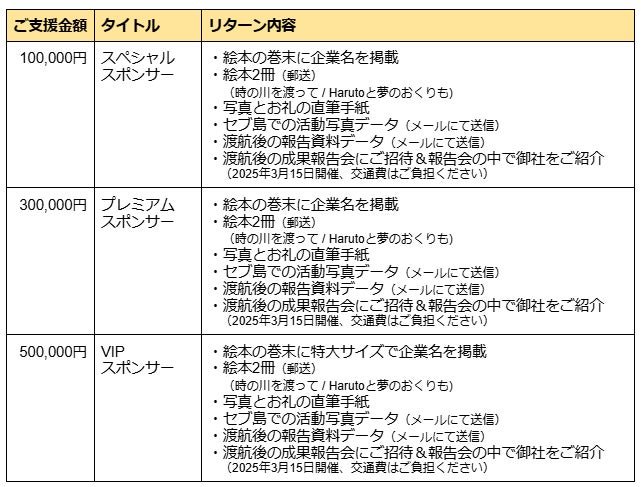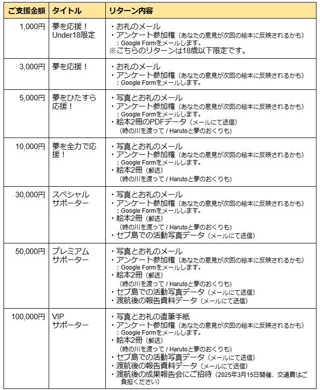 皆さまからのご支援に感謝を込めて、以下のリターンをご用意しています。(何口でもご支援可能です)