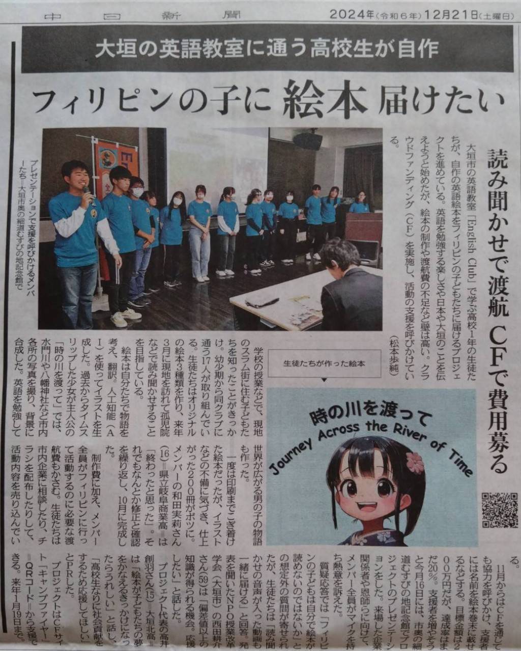 • 【中日新聞 2024.12.21】↓掲載内容です↓大垣の英語教室に通う高校生が自作フィリピンの子に絵本 ・届けたい読み聞かせで渡航 ・CFで費用募るプレゼンテーションで支援を呼びかけるメンバ ―たち 大垣市奥の細道むすびの地記念館で大垣市の英語教室「English Club」で学ぶ高校1年の生徒た ちが、自作の英語絵本をフィリピンの子どもたちに届けるプロジェ クトを進めている。英語を勉強する楽しさや日本や大垣のことを伝 えようと始めたが、絵本の制作や渡航費の不足など壁は高い。クラ ウドファンディング (CF)を実施し、活動の支援を呼びかけてい る。 (中日新聞 松本歩純さん著)学校の授業などで、現地のスラム街に住む子どもたちを知ったことがきっかけ。幼少期から同クラブに通う17人が取り組んでい る。生徒たちはオリジナル の絵本3種類を作り、来年3月に現地を訪れて孤児院などで読み聞かせすることを目指している。絵本は自分たちで物語を考え、翻訳。人工知能(A 1)を使ってイラストを生成した。過去からタイムス リップした少女が主人公の 「時の川を渡って」では、 水門川や八幡神社など市内各所の写真を撮り、背景に合成した。英語を勉強して世界が広がる男の子の物語も作った。一度は印刷までこぎ着け た絵本だったが、イラストなどの不備に気づき、仕上がった200冊がボツに。 メンバーの和田実莉さん (16) =県立岐阜商業高 は 「終わったと思った」それでもなんとか修正と確認を繰り返し、10月に完成し た。制作費に加え、メンバー 全員がフィリピンに行って活動するのに必要な渡航費もかさむ。生徒たちは市内企業に相談したり、チラシを配布したりして、 活動内容を売り込んでいる。11月からはCFを通じても協力を呼びかけ、支援者には名前を絵本巻末に載せるなどする。目標金額は200万円だが、達成率はまだ20%。支援者を増やそう と今月16日には、市奥の細道むすびの地記念館でプロ ジェクトのプレゼンテーションをした。来場した企業関係者や恩師らに向けて、 メンバー全員がマイクを持ち熱意を訴えた。質疑応答では「フィリピ ンの子どもは自分で絵本が 読めないのではないか」と の想定外の質問が寄せられたが、生徒たちは「読み聞かせの音声が入った動画も一緒に届ける」と回答。発 表を聞いたNPO授業改革 学会(大垣市)の西田耕介 さん(59)は「偏差値以上の知識が得られる機会。応援したい」と話した。プロジェクト代表の高井創羽さん(15)=大垣北高は「絵本が子どもたちの夢をかなえるきっかけになったらうれしい」と話し、 「高校生なりに社会貢献をするため応援してほしい」 とPRした。プロジェクトはCFサイ ト「キャンプファイヤー」 QRコード=から支援で きる。来年1月19日まで。素敵な掲載に胸躍りました! もっと見る