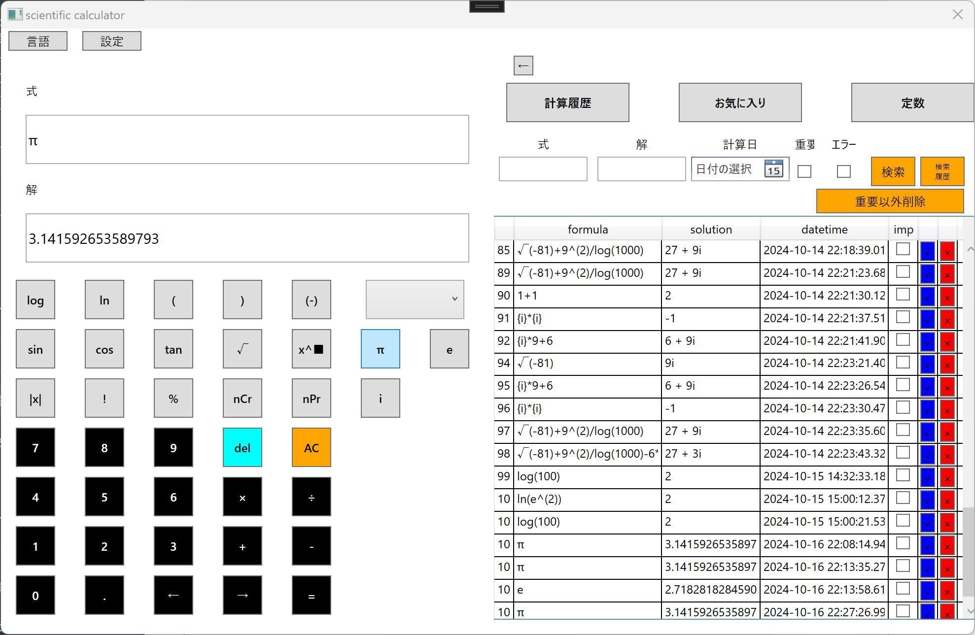 本日打ち合わせに行ったので進捗はあまりありませんが、πとeの実装が出来ました。画面右側の計算履歴を見ていただければと思いますが、算出結果が載っていると思います。