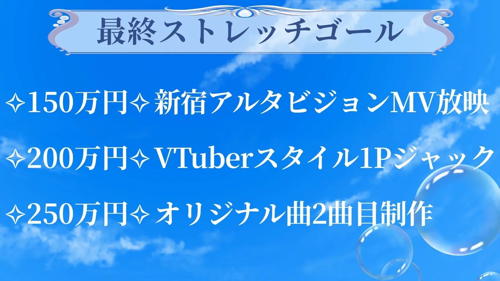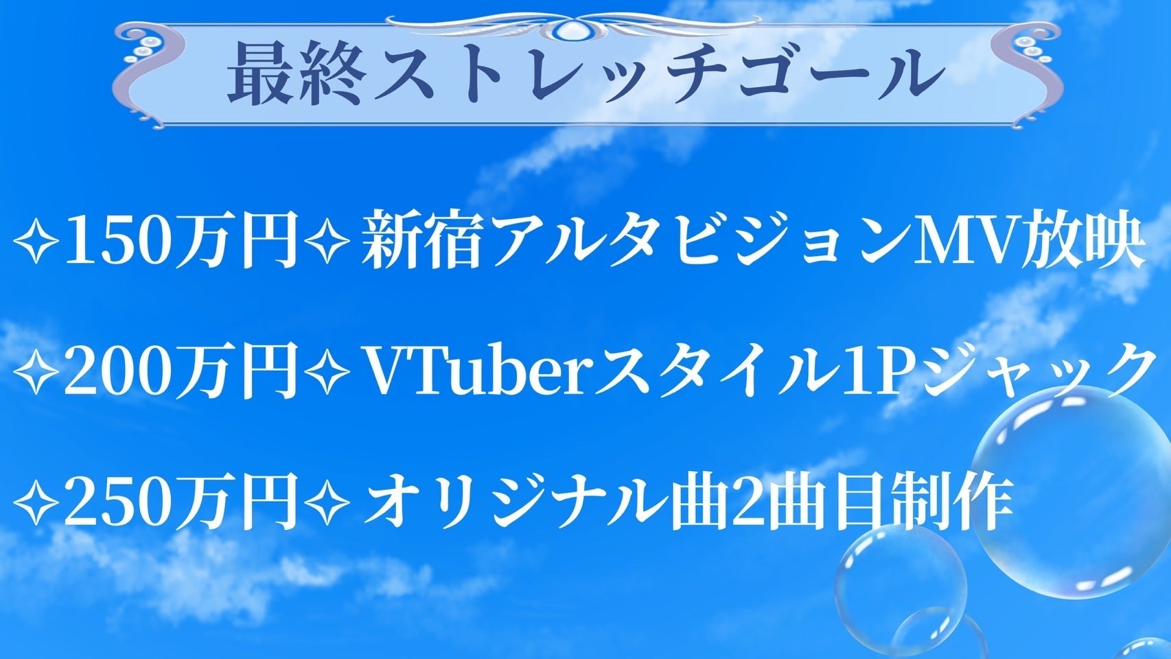 今回は【初オリジナル曲】に続き、2曲目の制作を、最終ストレッチゴールとして設けさせていただくことに致しました。