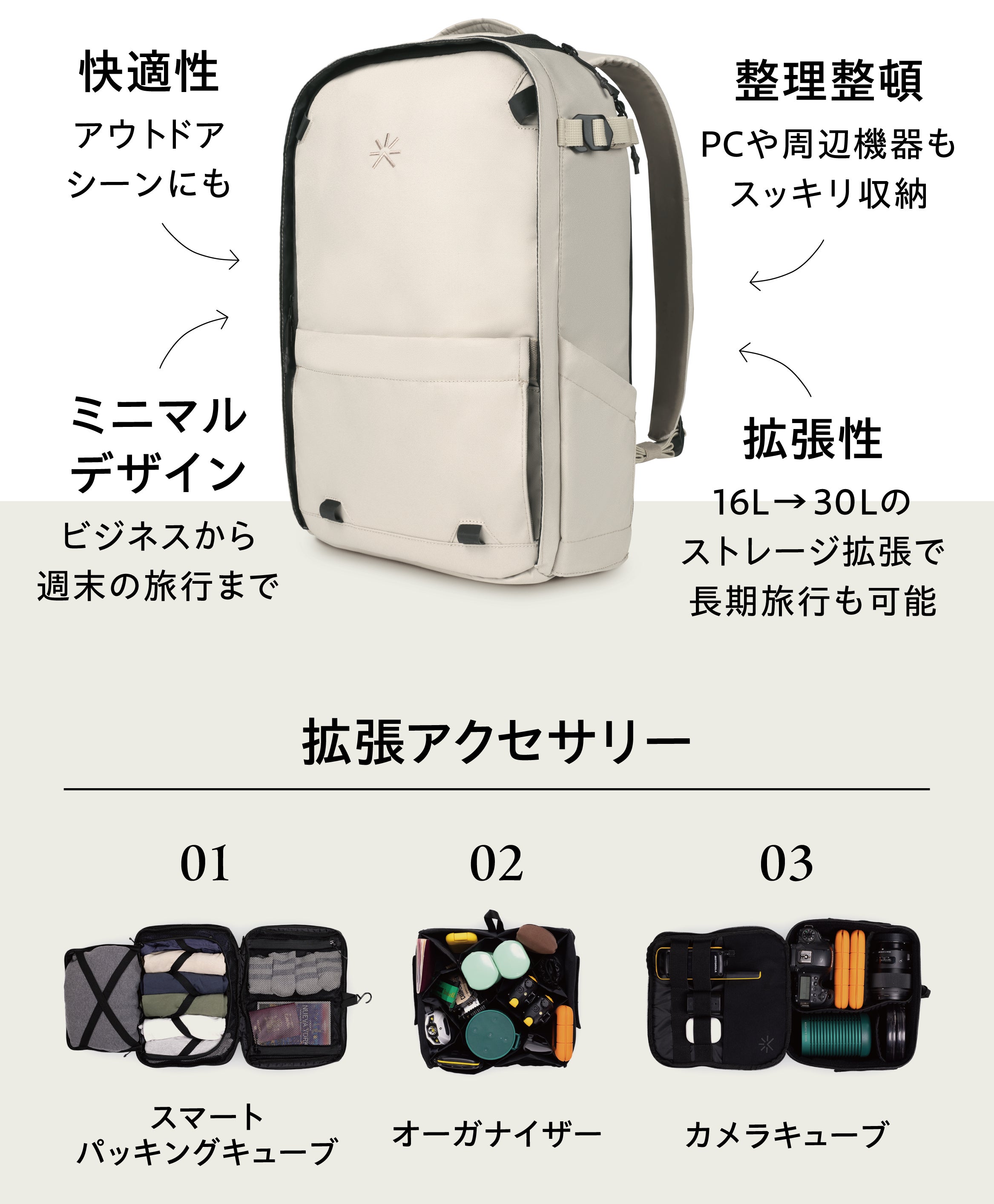 TROPICFEEL Nestが他のバックパックと違うのは、 シーンに合わせて容量を調節できる "モジュール式" なところ。