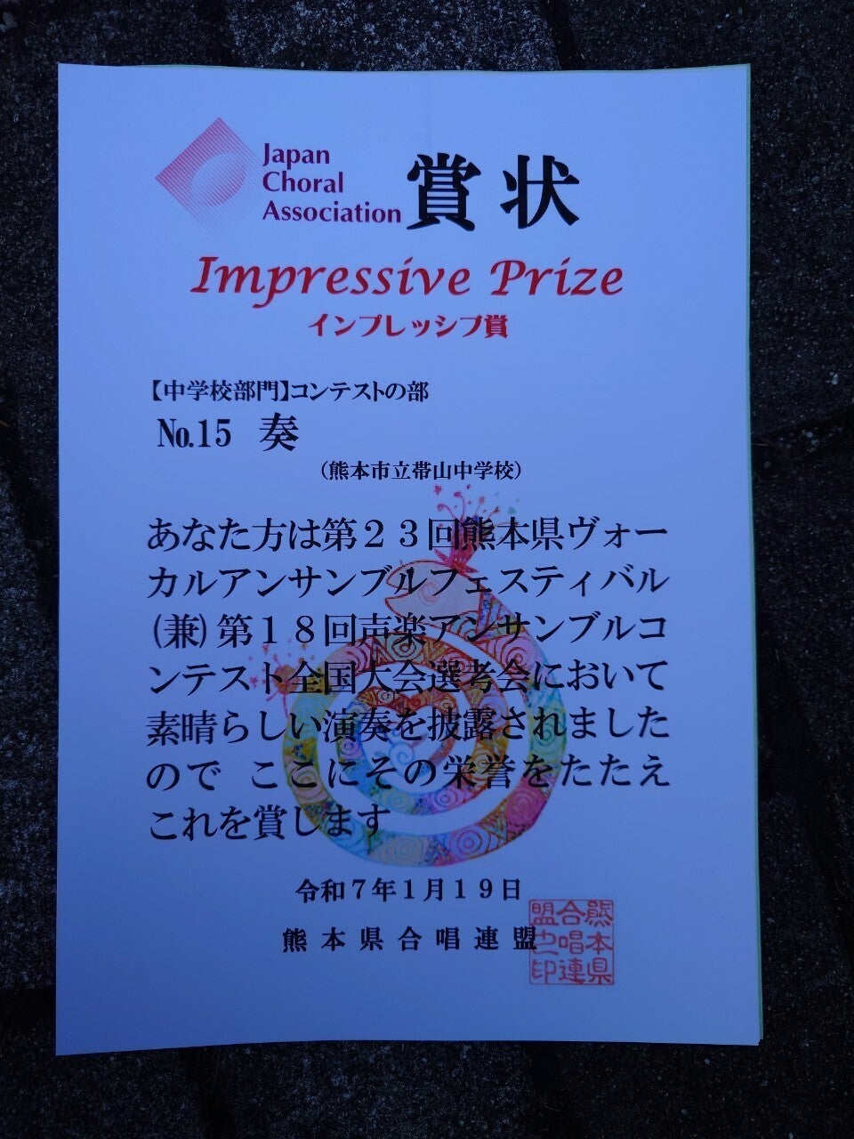 この度、初めて1,2年生で出場しました、第23回熊本県ヴォーカルアンサンブルフェスティバル(兼)第18回声楽アンサンブルコンテスト全国大会選考会にて、インプレッシブプライズ及び初の全国大会への出場権を獲得いたしました!!