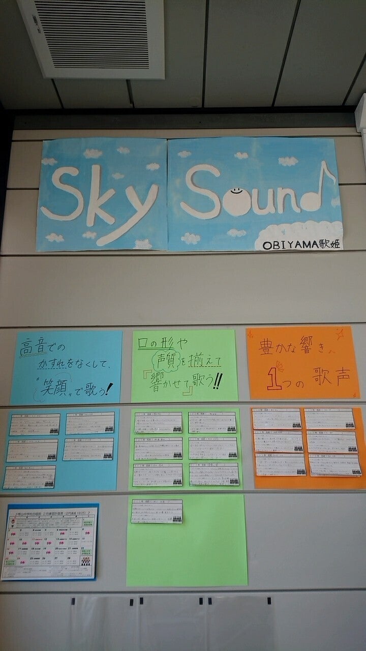 現在私たち帯山中学校合唱部は、1,2年生18名『SkySound』をモットーに、楽しく、心に響く音楽づくりを目標に日々練習に励んでいます。
