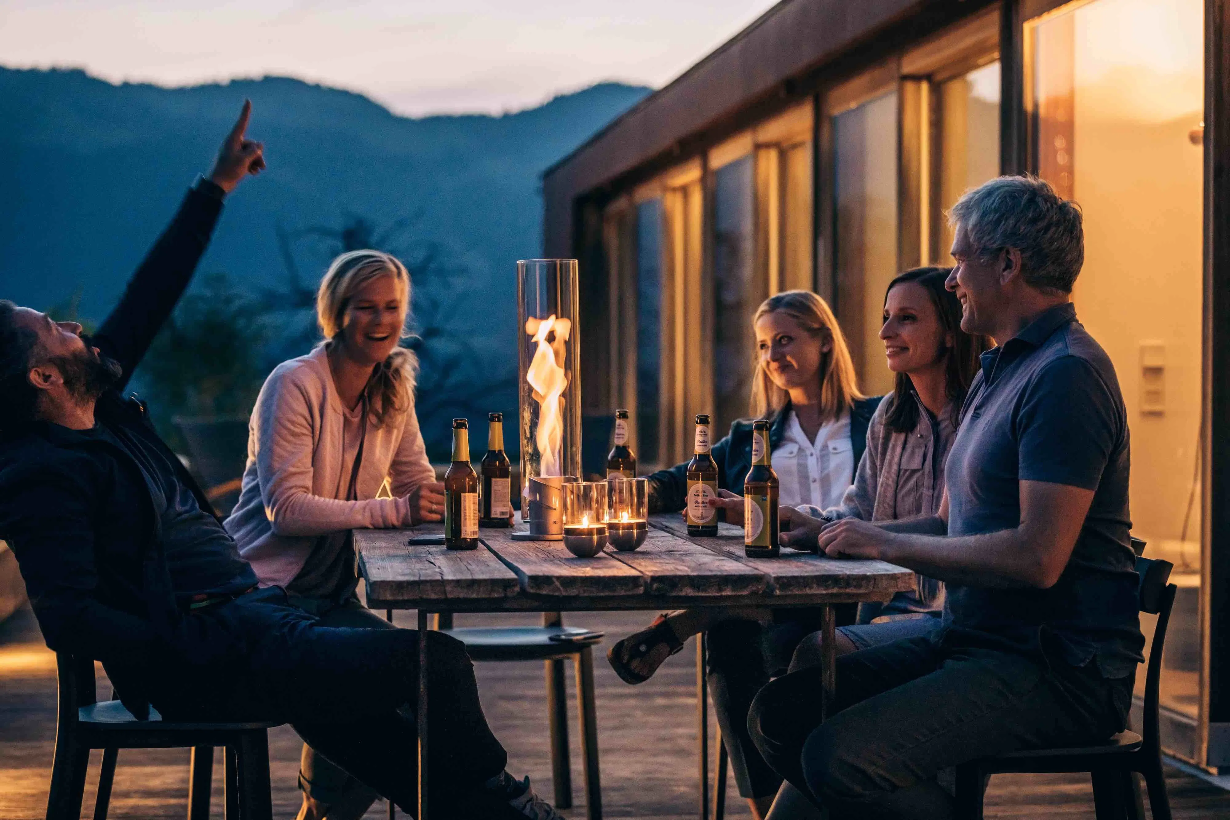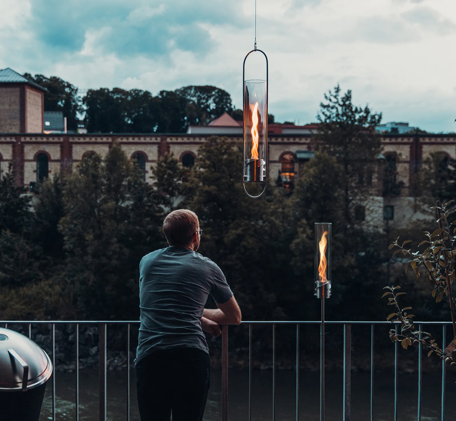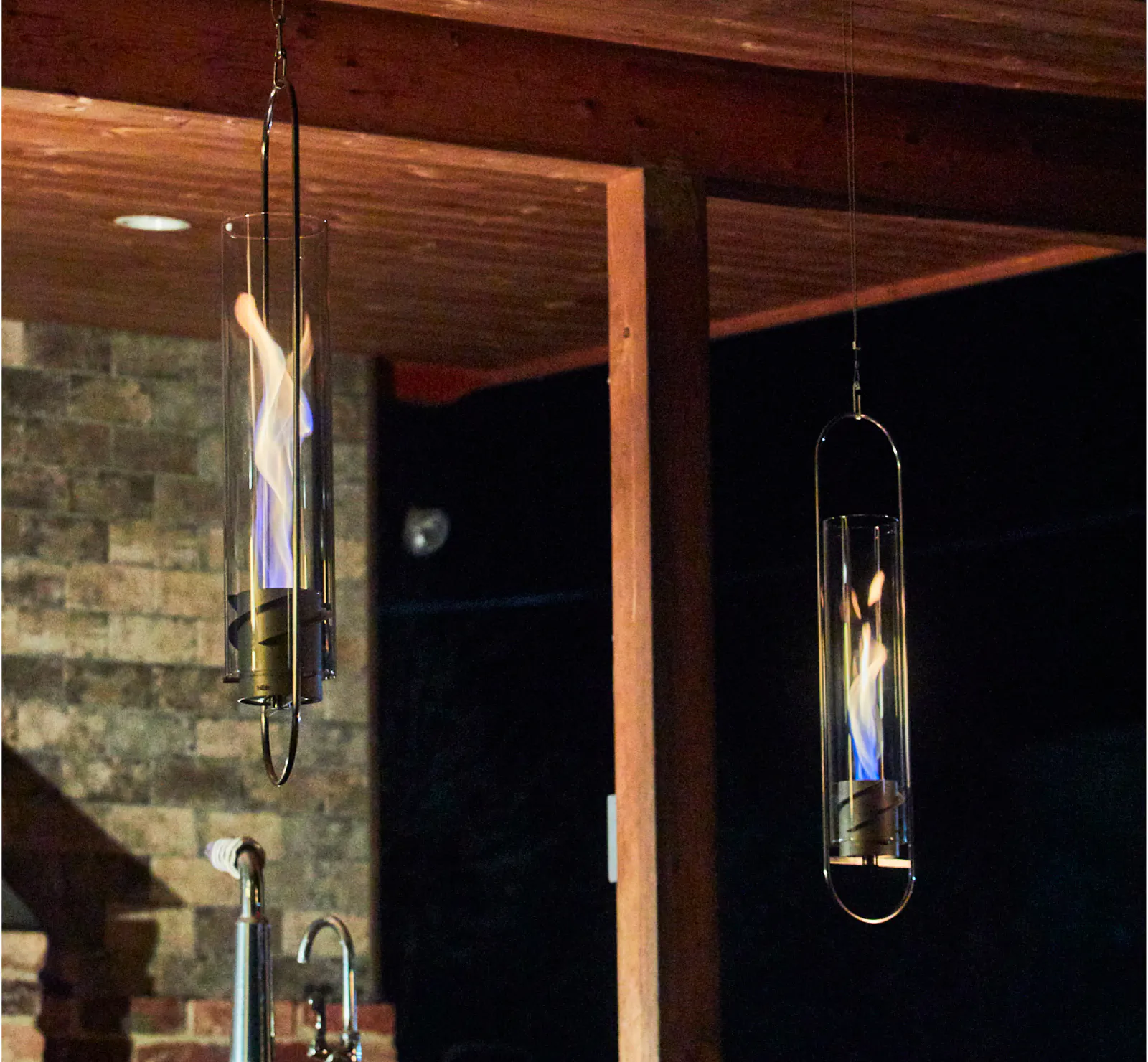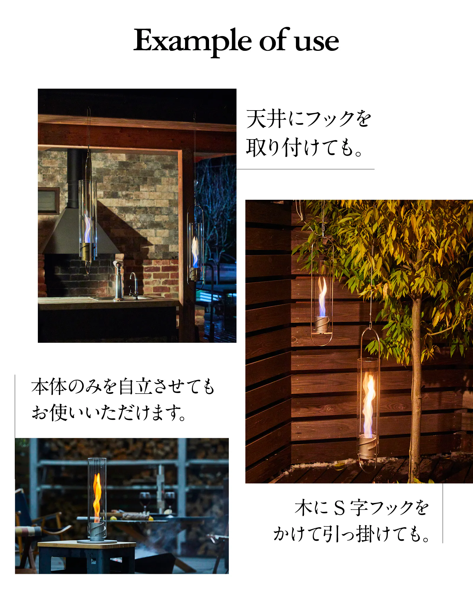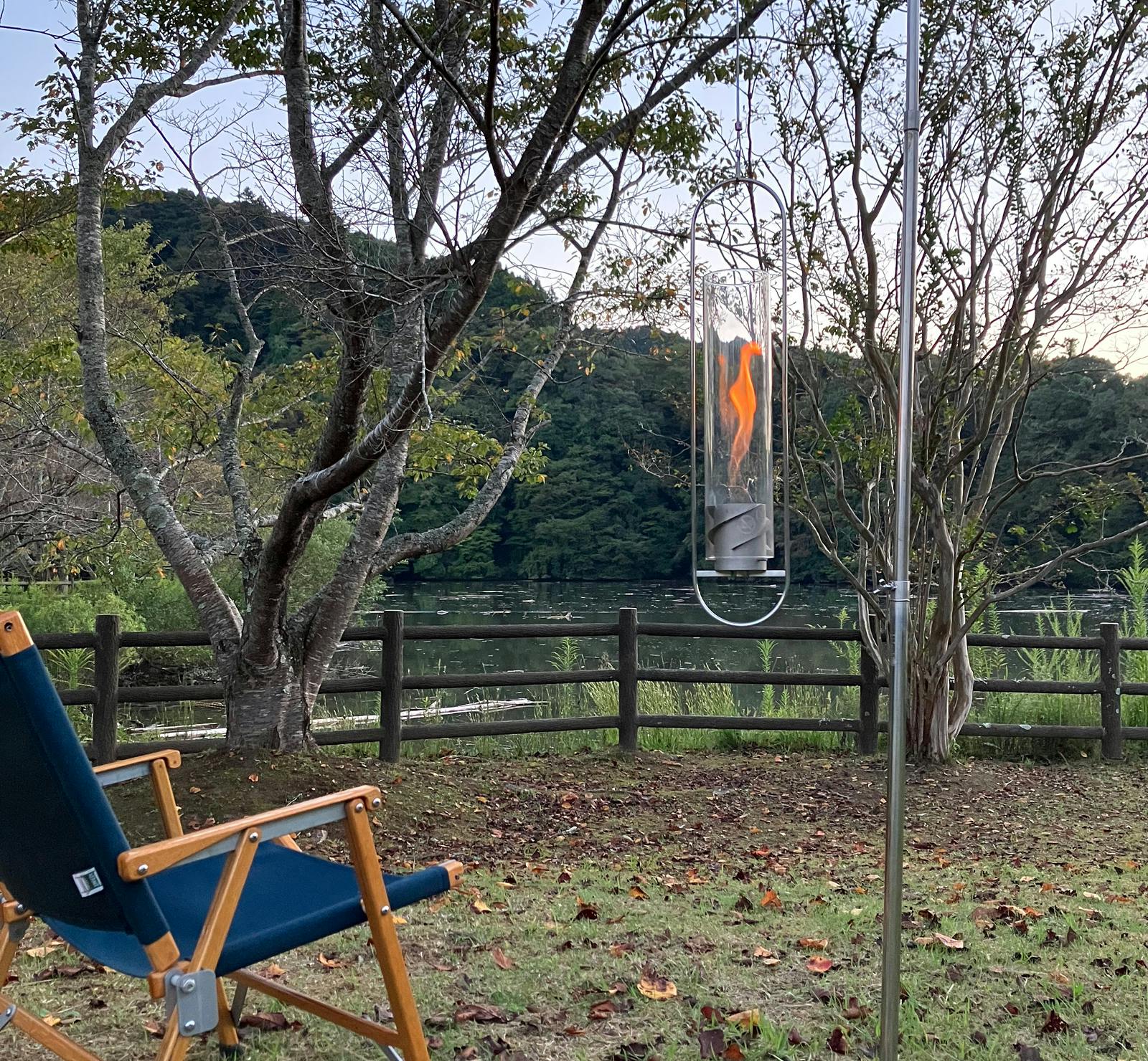 新たに追加されたハンガーセットにより、炎を目の高さで楽しむことができるようになったのです。室内でもアウトドアでも、炎が宙を舞う様子を、真下から見上げるという新しい角度からの視点。これまでになかった新しい炎の楽しみ方を体験いただけます!