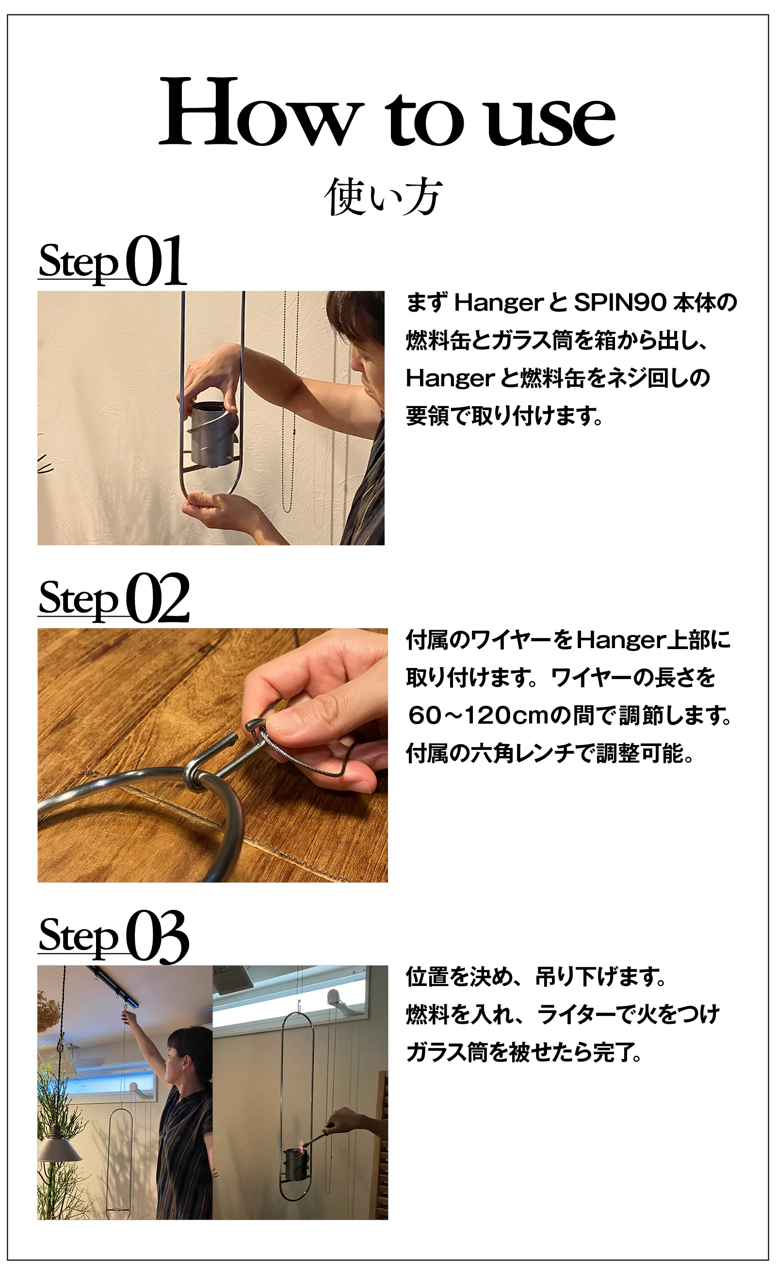 従来のランタンや焚き火は、大抵は同じ高さやや高い位置から炎を楽しむものですが、新ハンガーにより、SPIN90は天井や枝から吊るして使用することができます。これにより、炎を下から見上げる、新しい視点での体験が可能となりました。この新しい視点は、炎の動きや形をより立体的に感じさせ、新しい感動をもたらします。