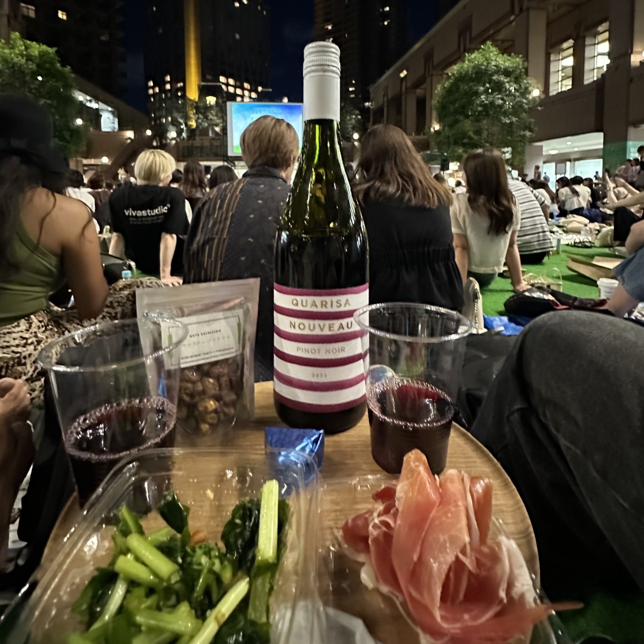 テーブルと椅子を準備して、ワインやお洒落なおつまみとともに飲食を楽しむ方。