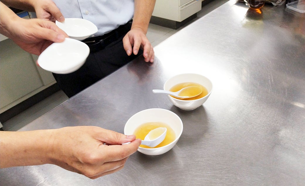 その後は何度もおでん屋台に足を運び、味を確かめ、そこから何度も研究開発チームと試行錯誤を繰り返しました。市販のおでんスープのような単調な味ではなく、練り物、牛筋など定番のおでん種と一緒に数時間煮込んだ屋台のスープの味わいが出るように、エキスの配分や旨味、塩味の調整を丹念に行いました。
