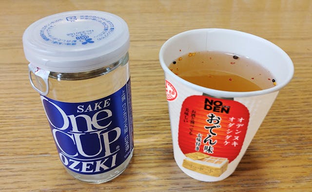 このおでん屋台ではワンカップ大関の日本酒を半分飲んだところにスープ出汁を足して飲む、だし割酒が人気のようだ。