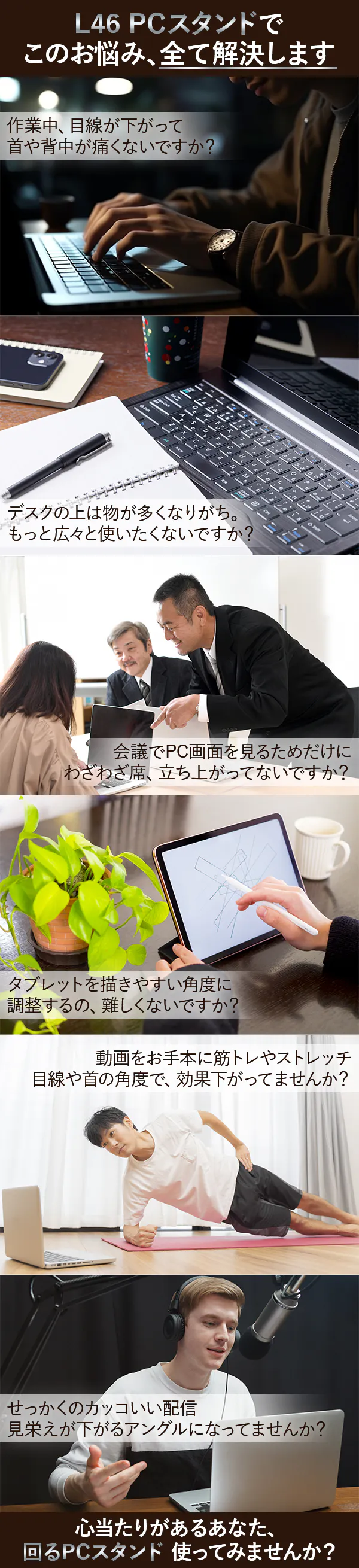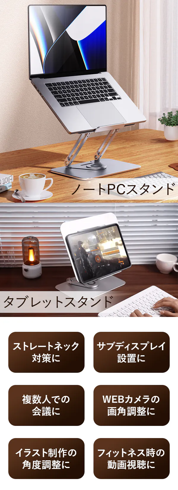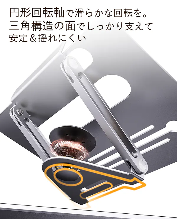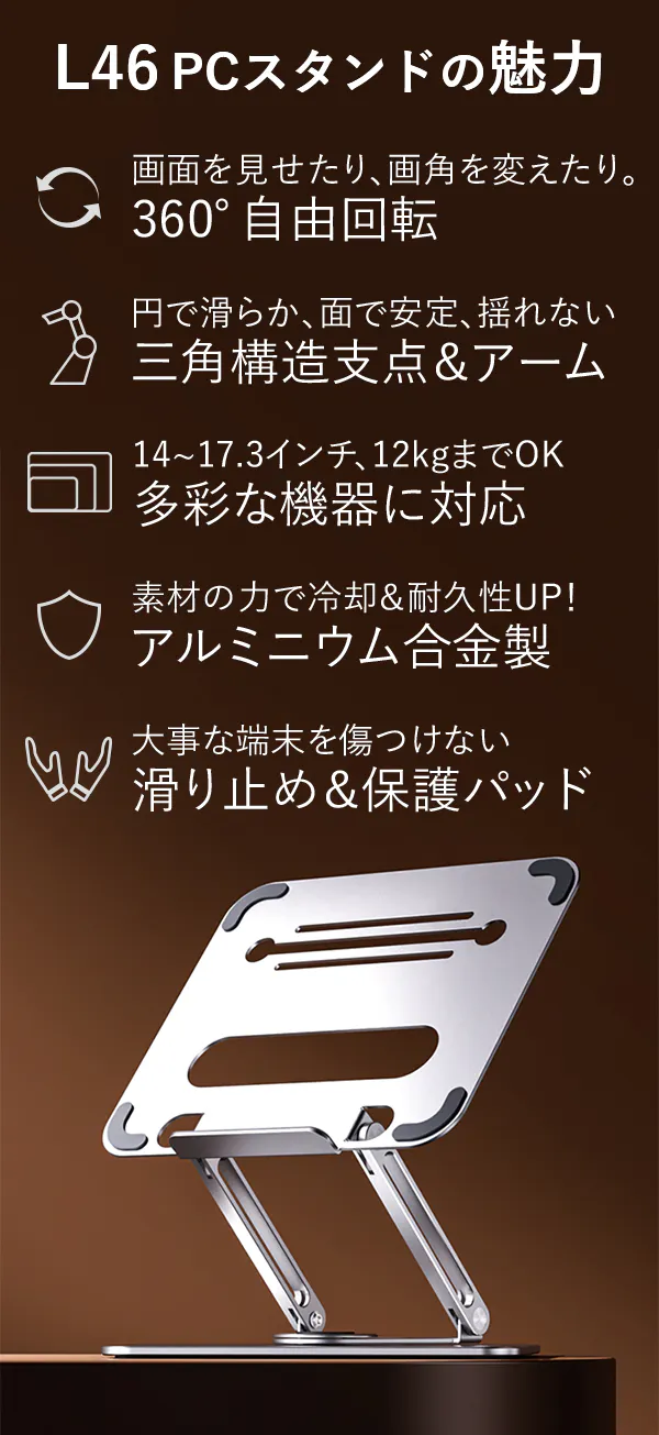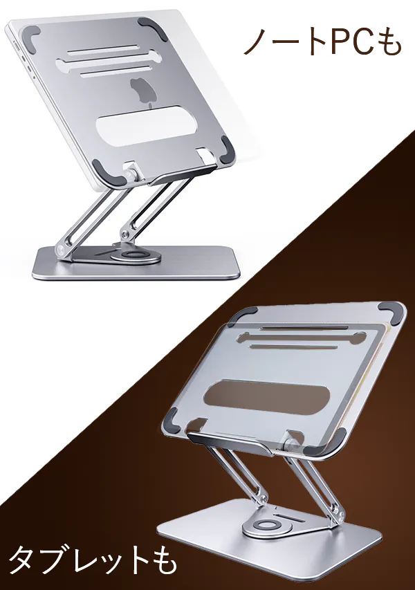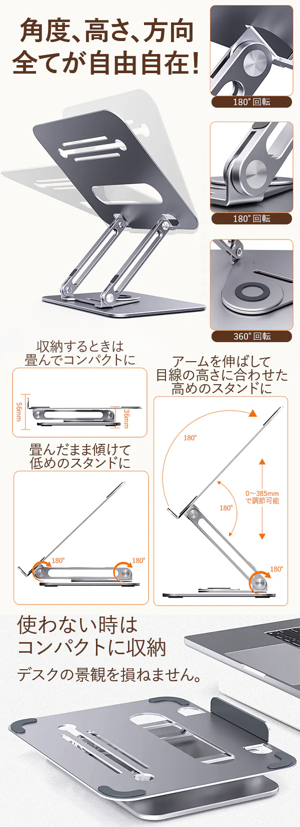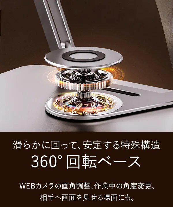 そんな困りごとを全部まとめて解決できる、360°回転&自由調節アームのPCスタンドです!しまう時には畳んでコンパクトに、アームを畳んだままロースタンドに、アームを伸ばして目線に合わせて、あらゆる場面で活躍してくれます。