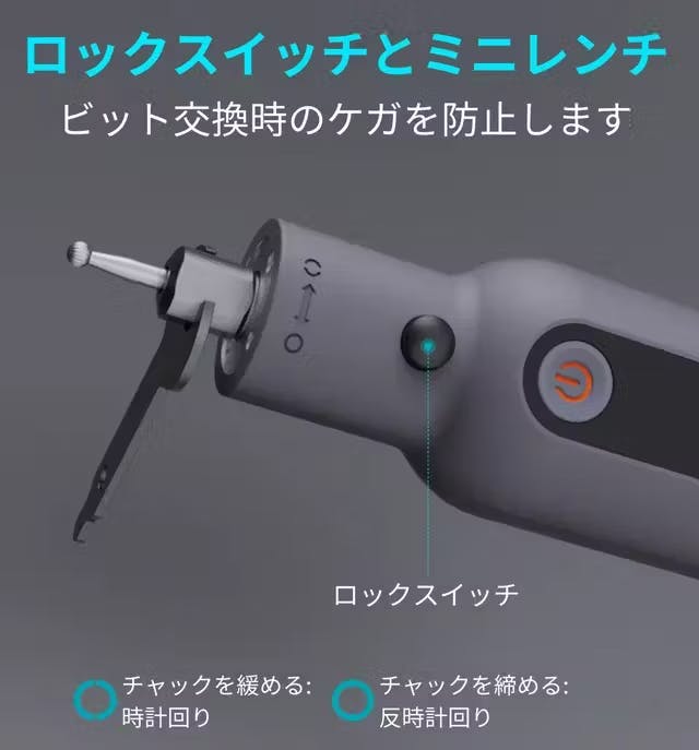 また、安全性にもこだわり、作業中だけでなくビット交換時での負傷を防げるようロックスイッチや交換用のレンチなども搭載。