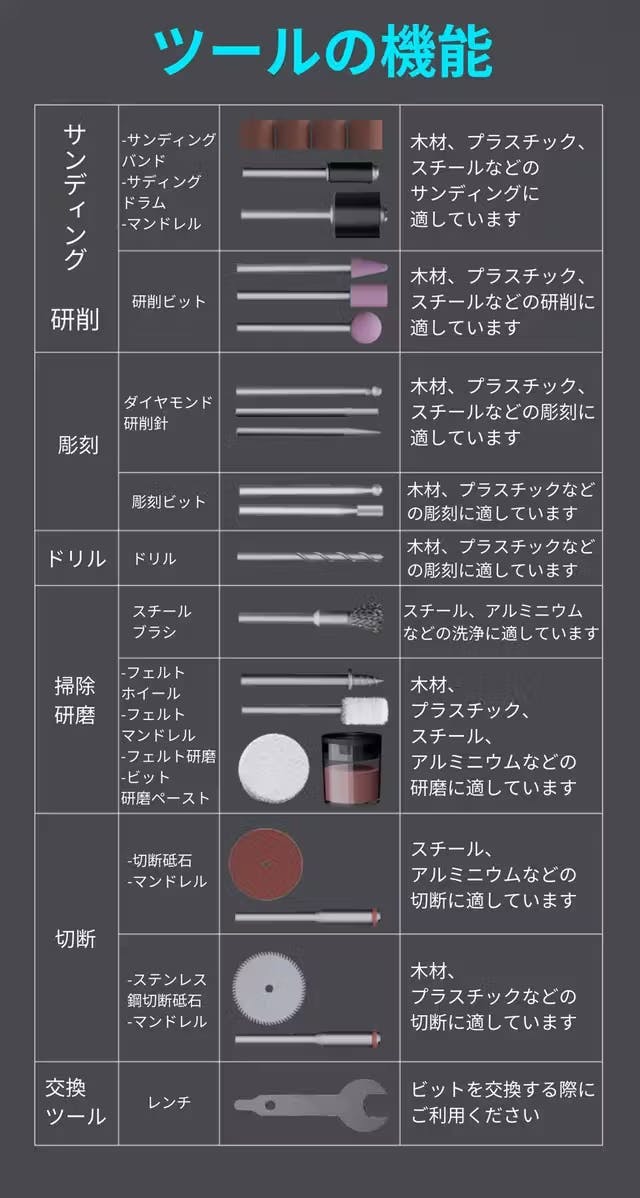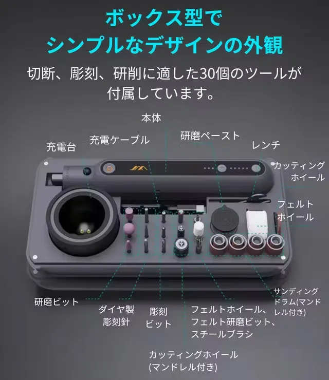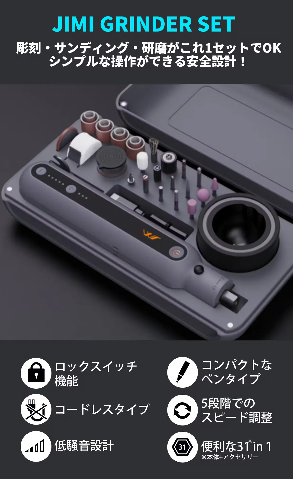 JIMI GRINDER SETは、大がかりで難易度が高くなりがちな電動での研磨・研削・サンディングを簡単にかつ安全にできるように設計されたコンパクトでシンプルな30in1のツールセット。