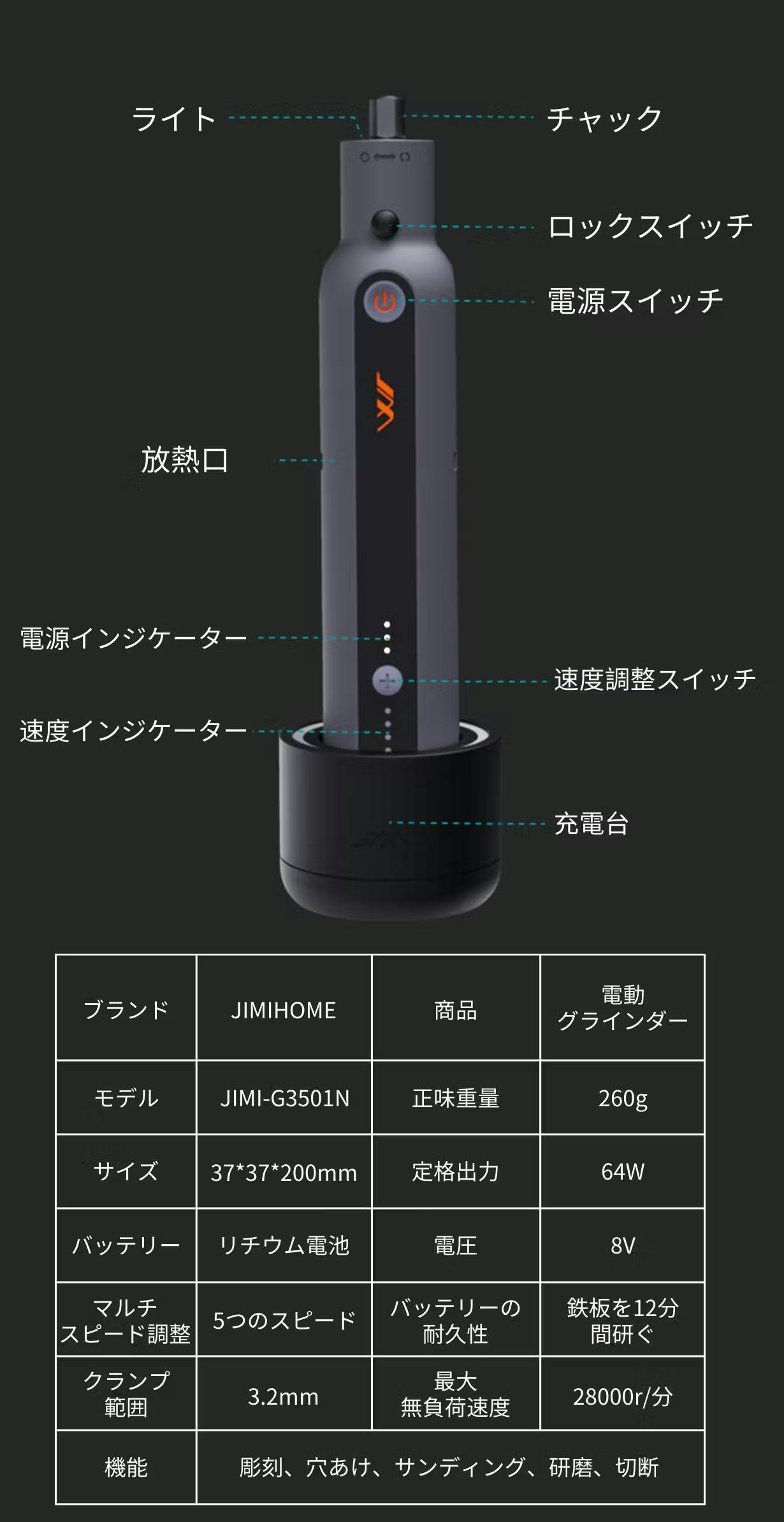 JIMI GRINDER SETは5段階でスピード調整が可能となっており、作業内容に応じて適切な速度を選択できます。
