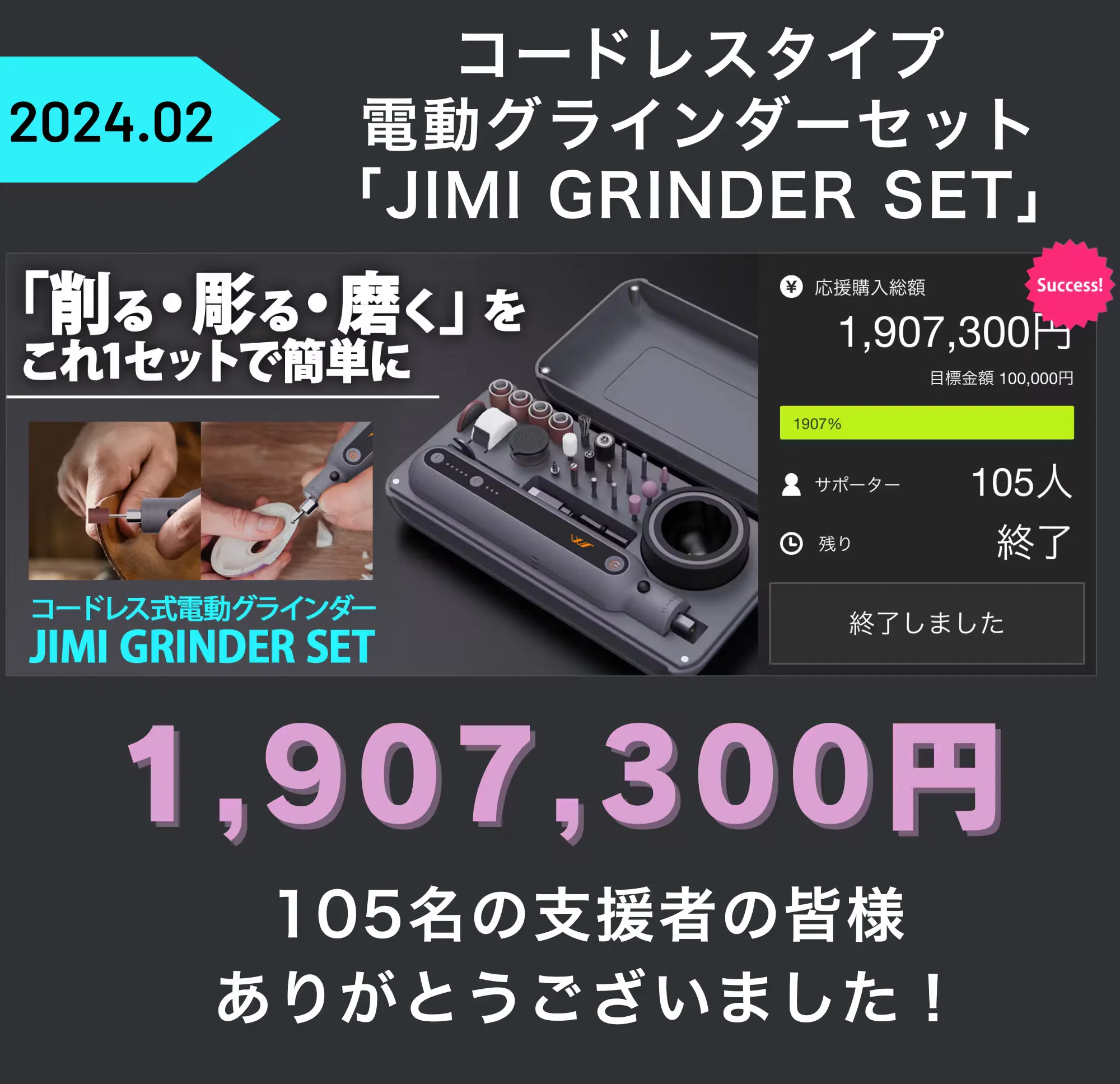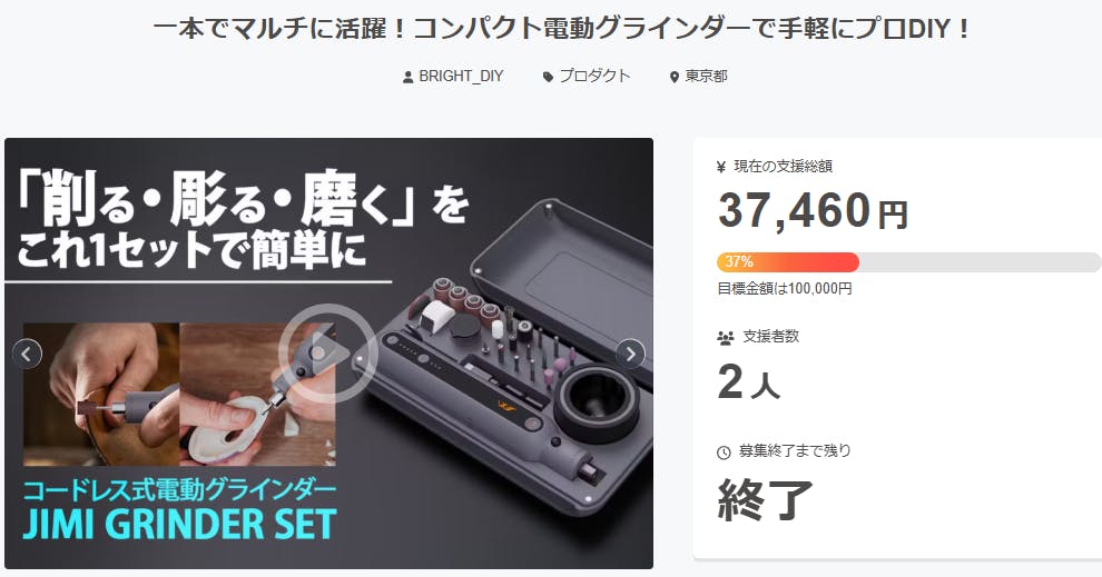 2025/01/01 00:15ご支援者様、一本でマルチに活躍!コンパクト電動グラインダーで手軽にプロDIY!にご興味をお持ちいただきありがとうございます。プロジェクト開始から39日目で2人ものご支援者の方々より支援頂き、無事プロジェクト終了を迎えることが出来ました。早速皆様のリターンを2025年03月末にお届けできるよう準備を始めております!皆様にご満足いただけるリターンをお届けできるよう、全力で取り組んで参りますので引き続き、「一本でマルチに活躍!コンパクト電動グラインダーで手軽にプロDIY!」をよろしくお願い致します。BRIGHTチーム もっと見る