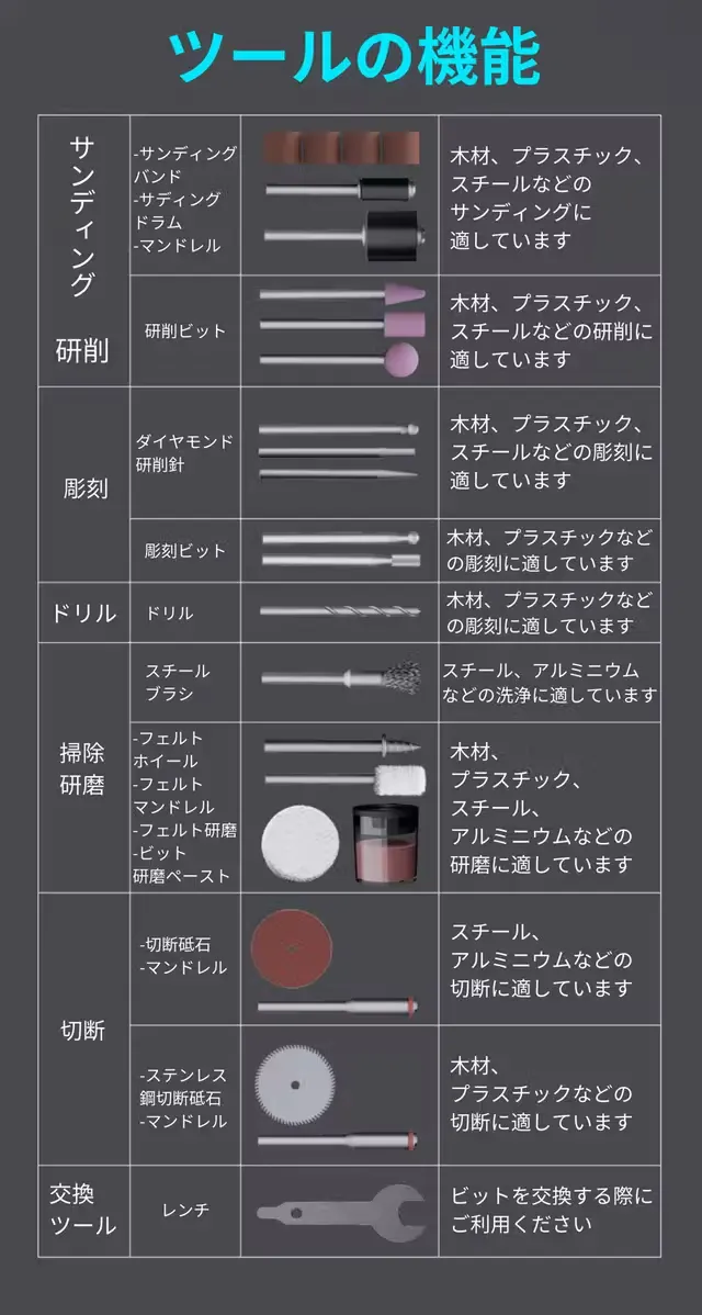 30個の便利なツールがコンパクトで軽量なケースに収められ、彫刻、穴あけ、サンディングなどの作業を外出先でも簡単に行えます。