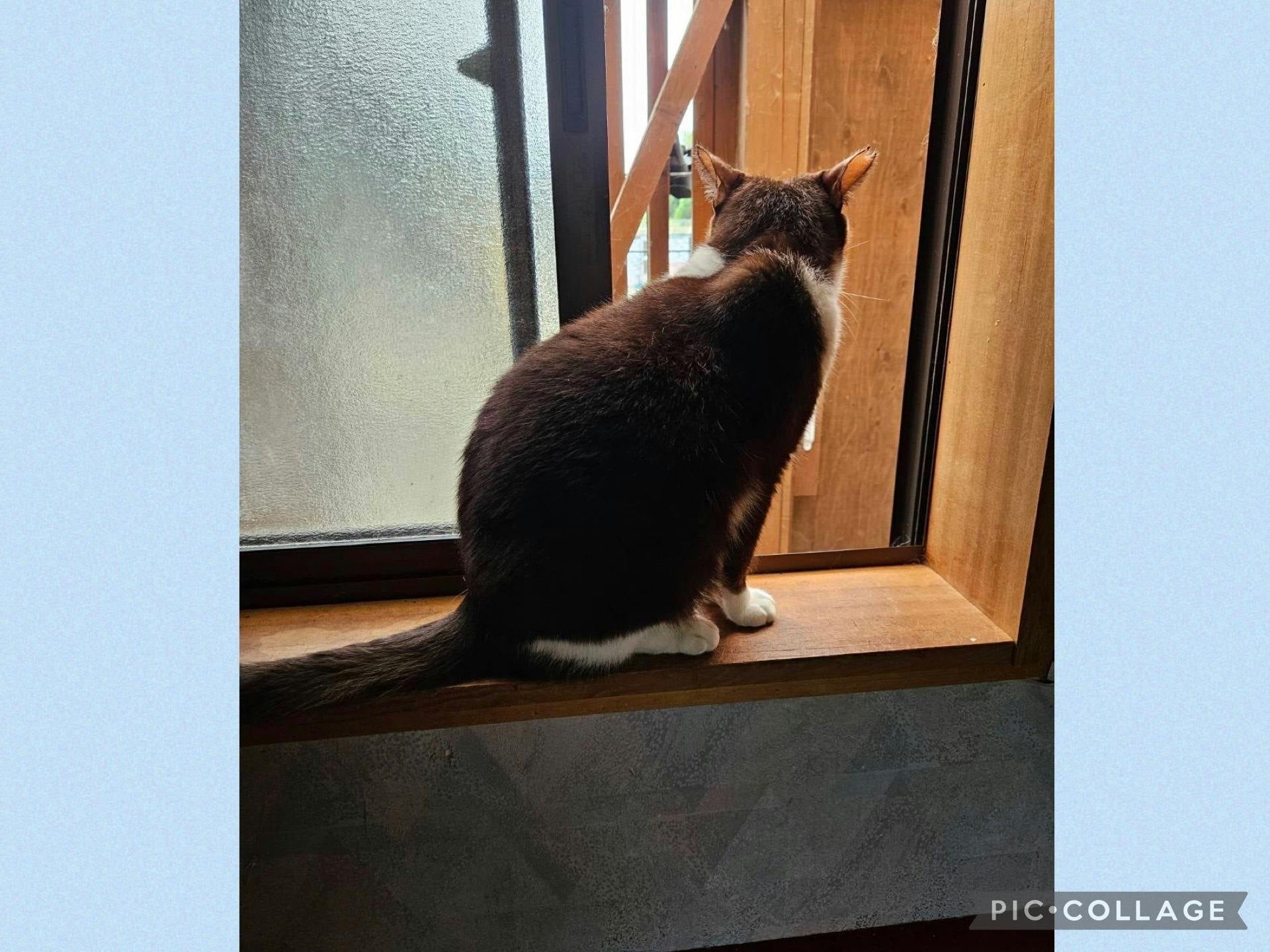 にゃんこたち、テラスへ通じる窓から外を見るのが好きです
