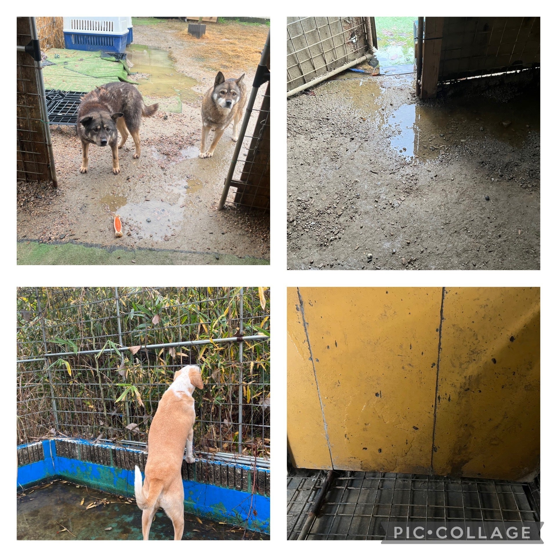 今のわんにゃんランドは雨が降ると、あちこちがプールのようになってしまいます。ドッグランが水浸しになるのは仕方ないのですが、犬舎まで水が入り込んでしまうのです。ガンマンさんが手作りで建てたばかりの頃は、きれいで雨風を凌げてまた断熱材を使った屋根に作り直したりしてとてもよかったのですが水はけが悪いため木が腐ってきてしまい、直しても直しても、雨が振り込み、壁が傾き、扉が閉まらなくなったりします。ガンマンさんが、心を込めて作った犬舎で、命をかけて犬たち猫たちを守ってきましたが、建て替えなければなりませんどうか皆様のお力を貸してください笠井玲子