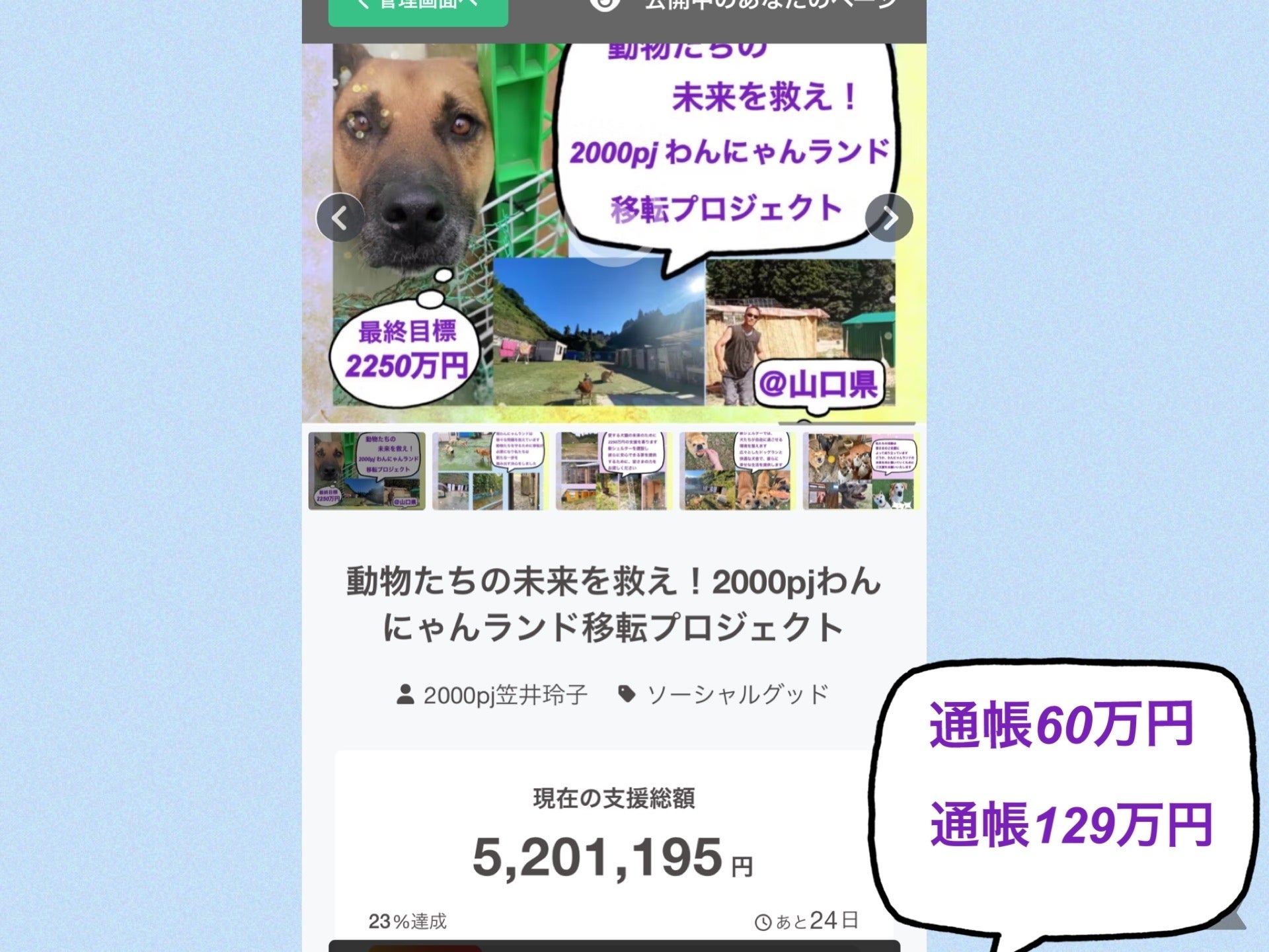 皆様より温かいご支援が520万円を超えました318人の方から 5,201,195円 ご支援いただいておりますそして、SNS をやっていない方が直接口座に振り込んでくださった額が30万円また山口のボランティアの方たちが集めてくださったご支援30万円 合計 60万円 足すと570万円になりますそして医療費、地代、光熱費、雑費などに使う口座へのご支援金が129万円でもこちらは急な手術や地代、光熱費などに使うためシェルター建設のためには使えないものですクラウドファンディングが終わる1/29まで24日あと24日で1700万円をご支援いただくのは難しいかもしれません集まらなければすぐに第2弾のクラウドファンディングをはじめますとにかく夏までにはなんとか移転させてあげたいです!どうか皆様さらなるお力を貸してくださいよろしくお願いいたします 笠井玲子