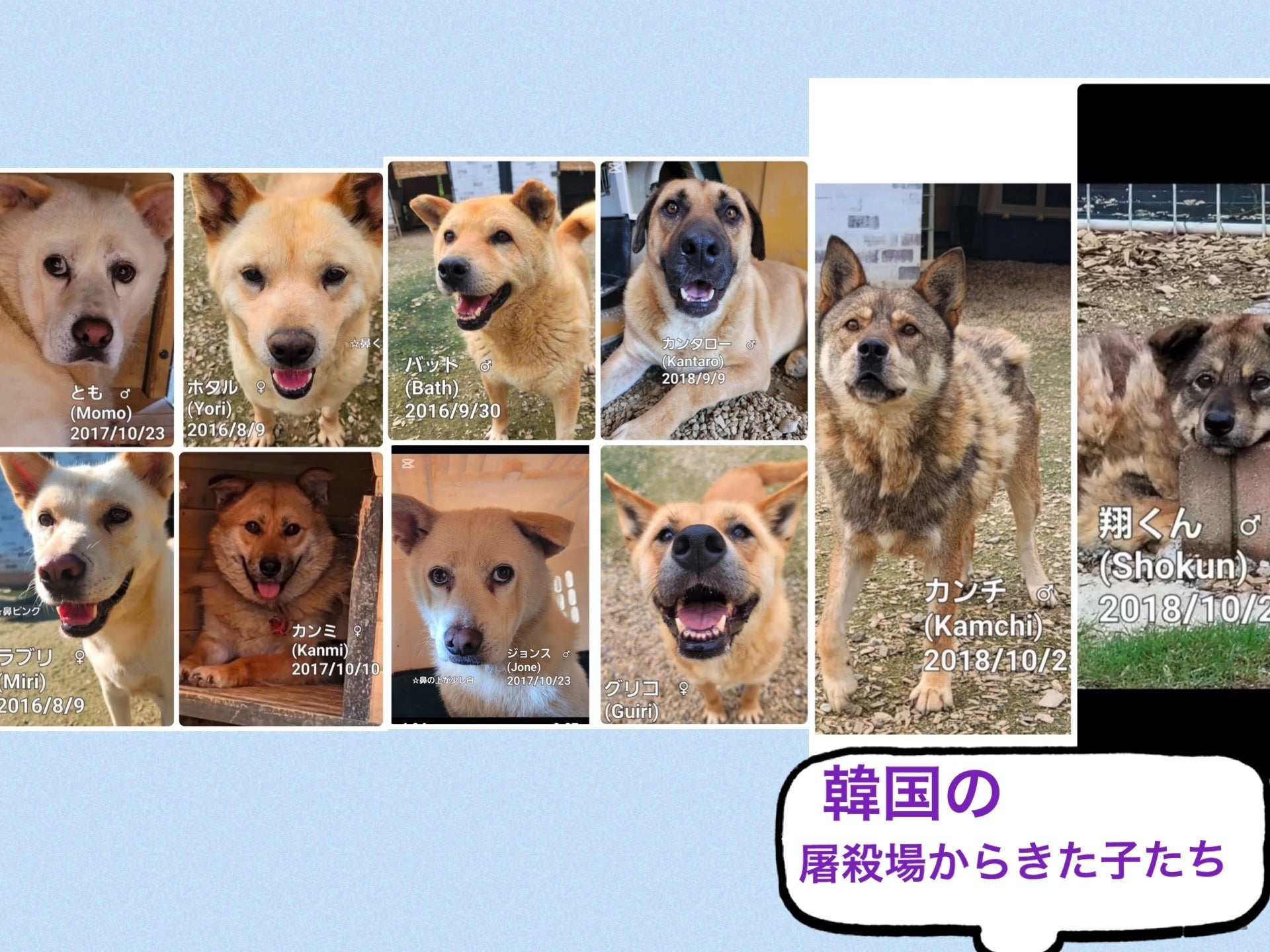 わんにゃんランドには韓国の犬肉食のための屠殺場からきた子たちが10頭います。韓国の生きたまま首をひもでくくられてぶら下げてバーナーで焼き殺すという残酷な殺し方をする屠殺場からきた子たちです。仲間たちが引きずって連れていかれ焼き殺されるのを見てきた子たちはひどいトラウマを抱えています。きたばかりの頃はおびえていましたが、すぐにおやつをねだって出てくるようになりました。それでも慣れていないひとが来ると怖がっていましたが今では、触れる子も増えてきました。せっかく救われた命。。。輝かせてあげたいです おやつください!の図ガンマンさんが残したノートをもとにボランティアさんが作ってくれた韓国わんこたちの特徴や医療記録 笠井玲子