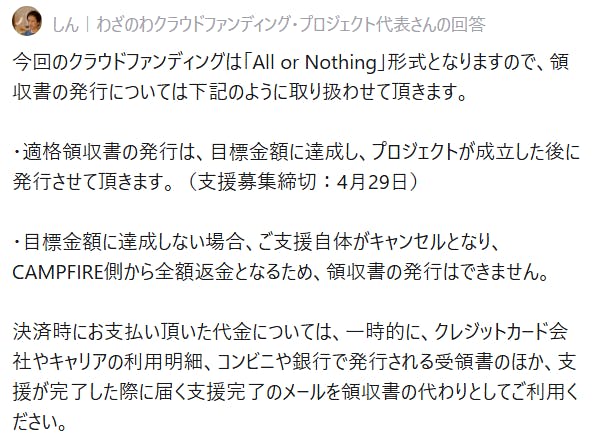 ご支援頂いた際の領収書の発行タイミングについて回答させて頂きました!