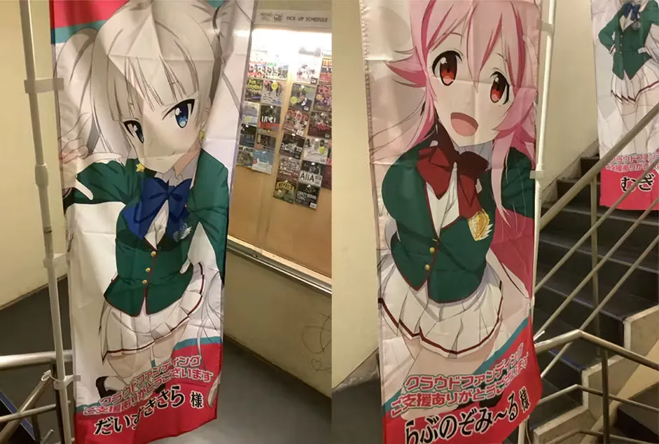 ライジングホールに行った方は分かると思うんですが、階段のところにあった演者さんの名前入りのぼりも、萌えサミファンディングで応援してくださった支援者さんののぼりになります。