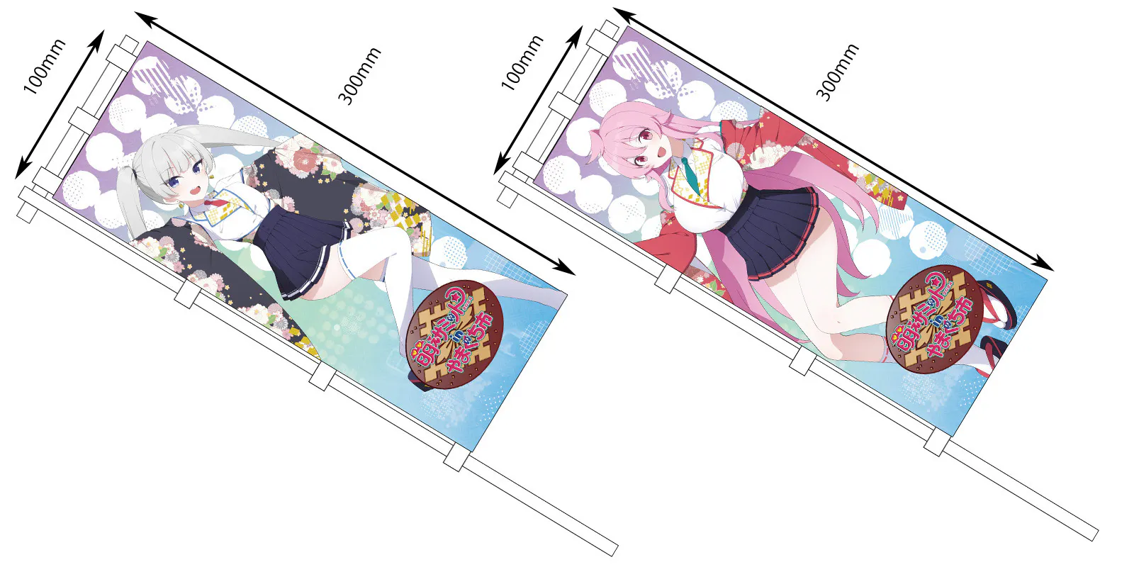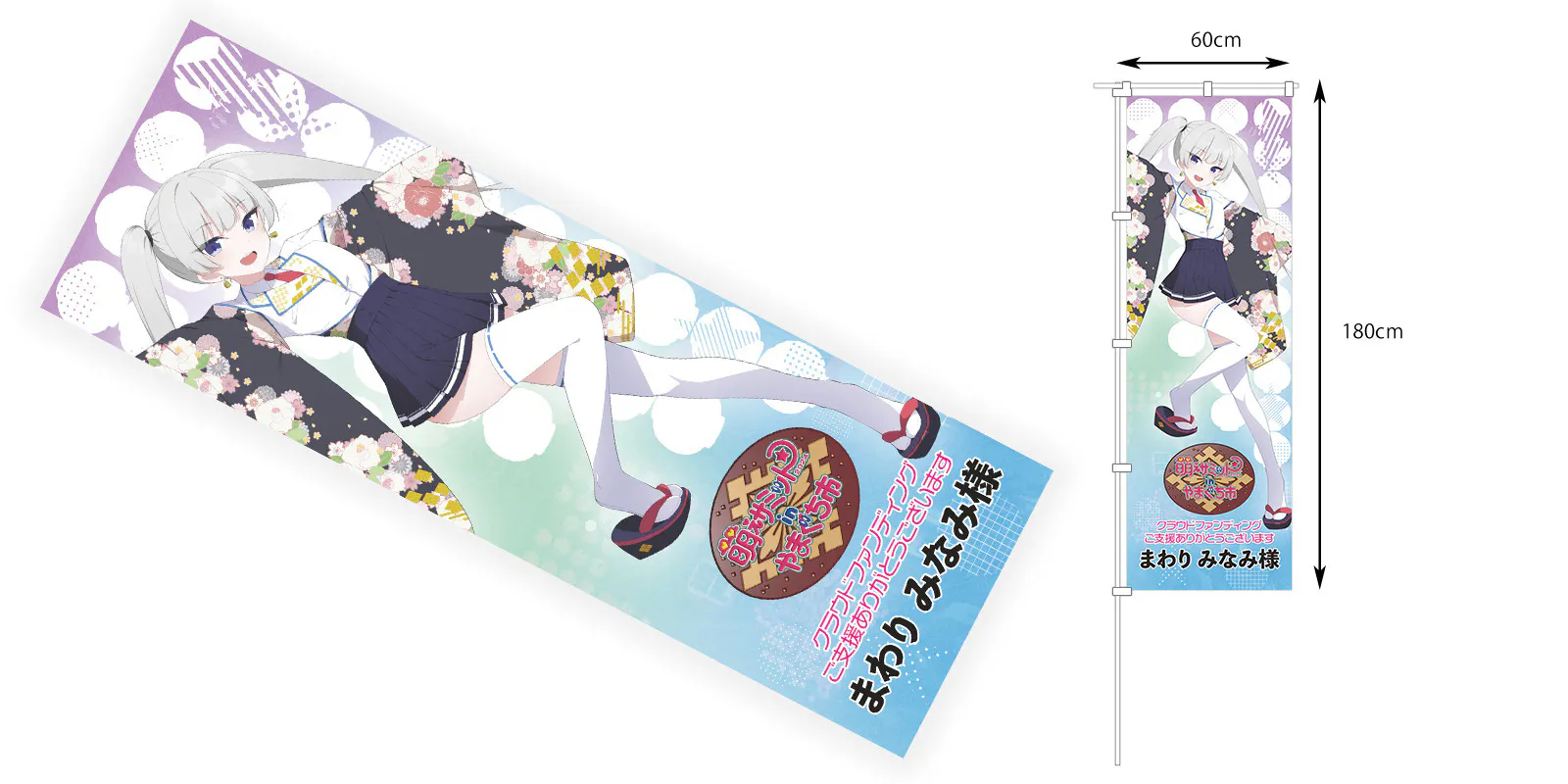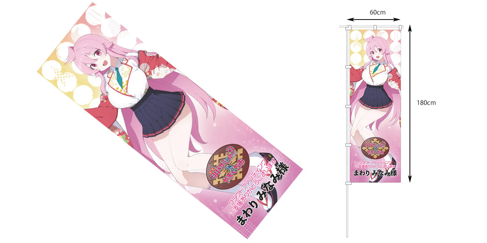 のぼりは、横60cm×縦180cmのビッグサイズで、のぼりとして使うのはもちろん、ほぼ等身大タペストリーや、助手席に敷いて痛カバー……みたいな使い方も出来ちゃう、使い方は無限大のお品となります(抱き枕に使うにはちょっとごわごわします)。