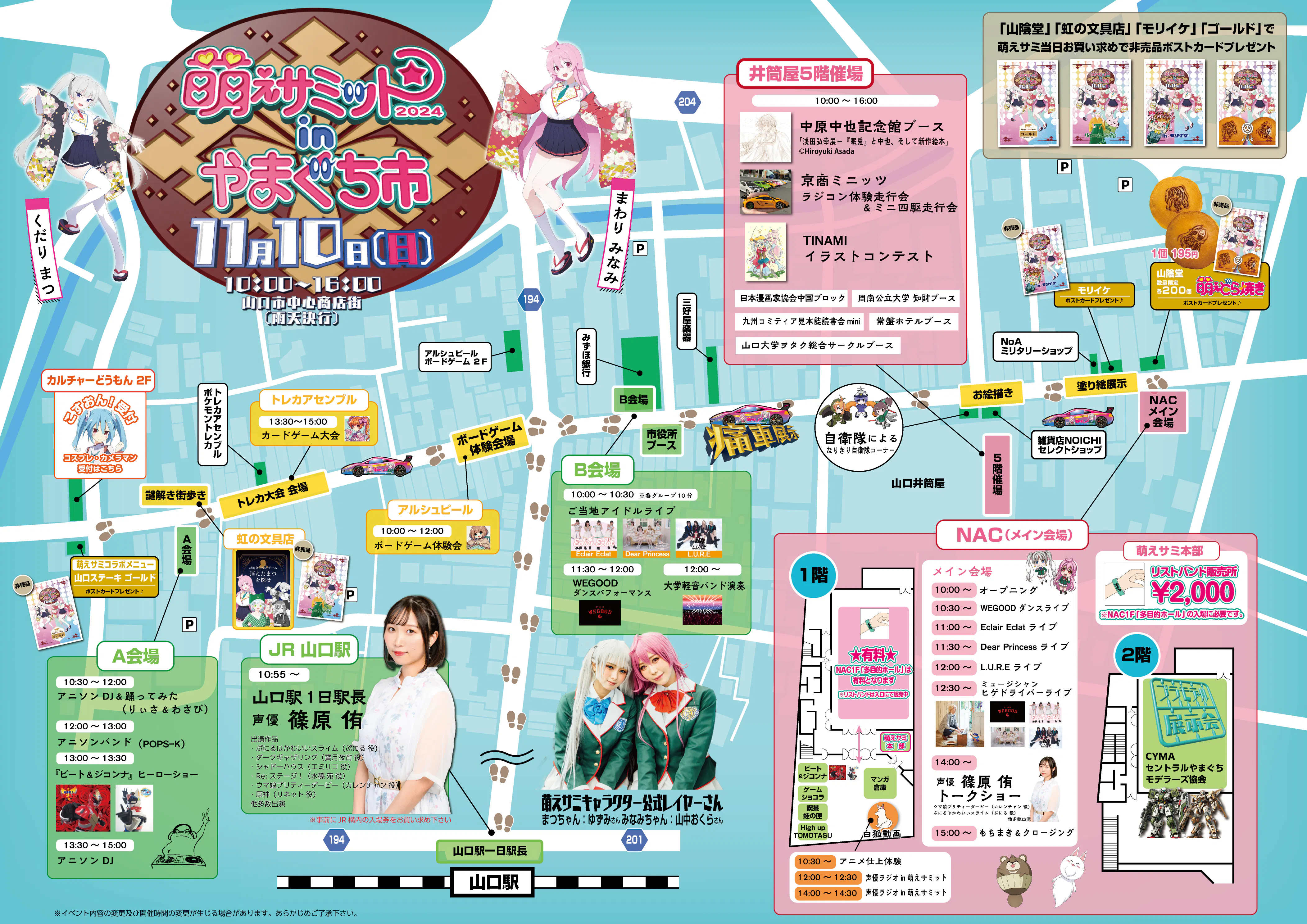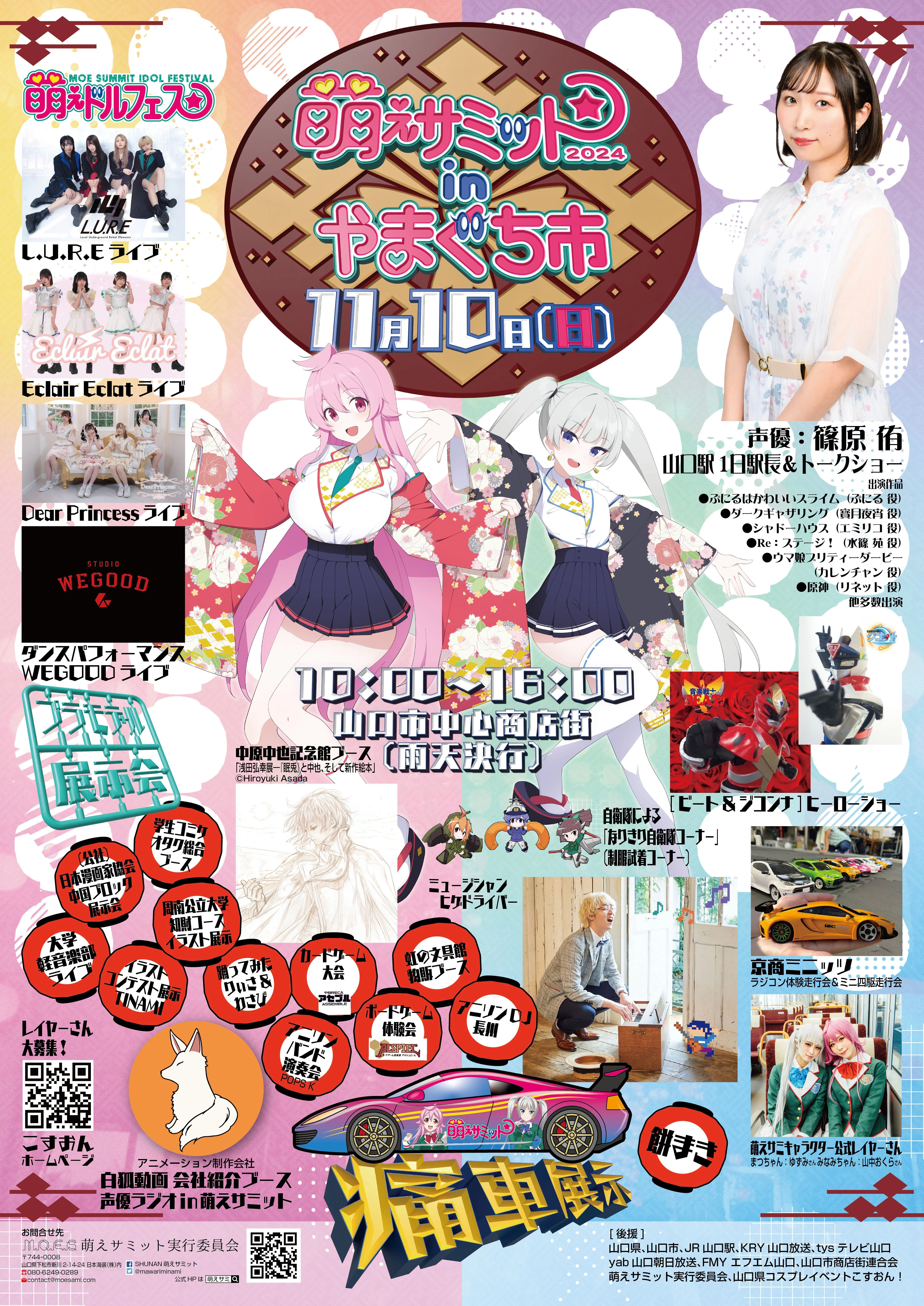 声優さんや業界人の皆さん(漫画家さんやイラストレーターさん、プロモデラーの方も!)のディープなトークショーがあったり、ご当地アイドルさんのライブがあったり、コスプレイヤーさんが街中にあふれたり、同人誌即売会に痛車にプラモ展示会、漫画家さんやゲーム資料の展示会があったりと、一日じゃ見切れないくらい&「(いい意味で)山口でこんな事やってるの?」って言われるくらいのお祭だったりします。