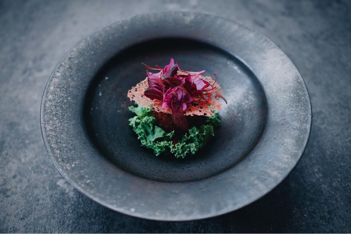 『一輪の薔薇』商人が手折ってしまった薔薇を、ビーツのチュイルやアマランサス、ケールで表現し、その下にズワイガニのクリームコロッケを忍ばせて。牛肉のトマトソースでいただきます。