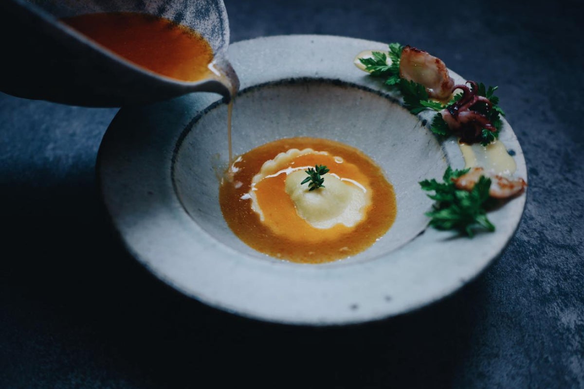 好奇心旺盛なベルをイメージした一品です。バッカラマンテカートのラビオリに魚介のスープを注ぎ、最後に余ったスープにはサフランライスを加えます。最後まで飽きることなく楽しめる構成に。