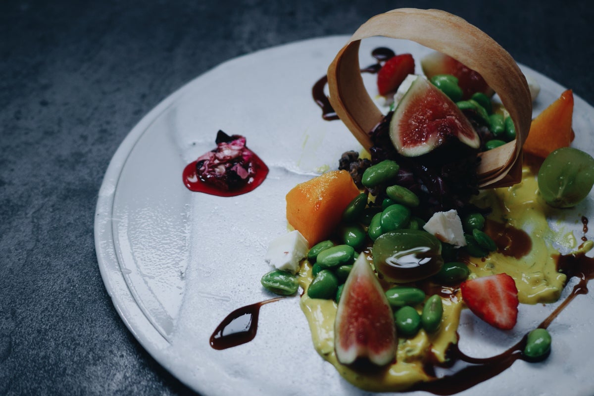 『美食家の食卓』ベルの父が迷い込んだお城で出会った料理をイメージし、旬のフルーツと北海道産枝豆を組み合わせて。スパイス香るヨーグルトソースに2種のビネガー、山羊のチーズを添え、口に運ぶ場所で味わいが異なります。