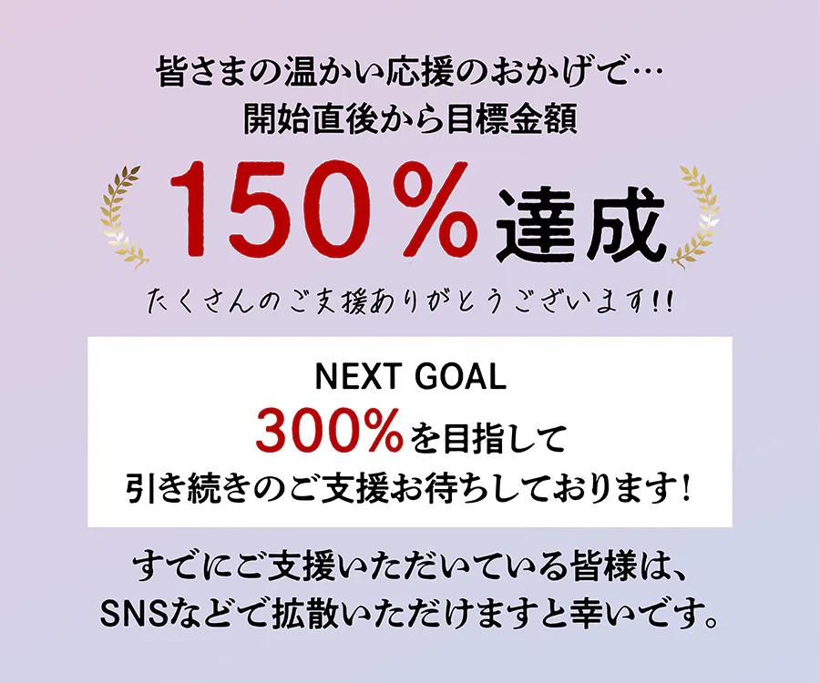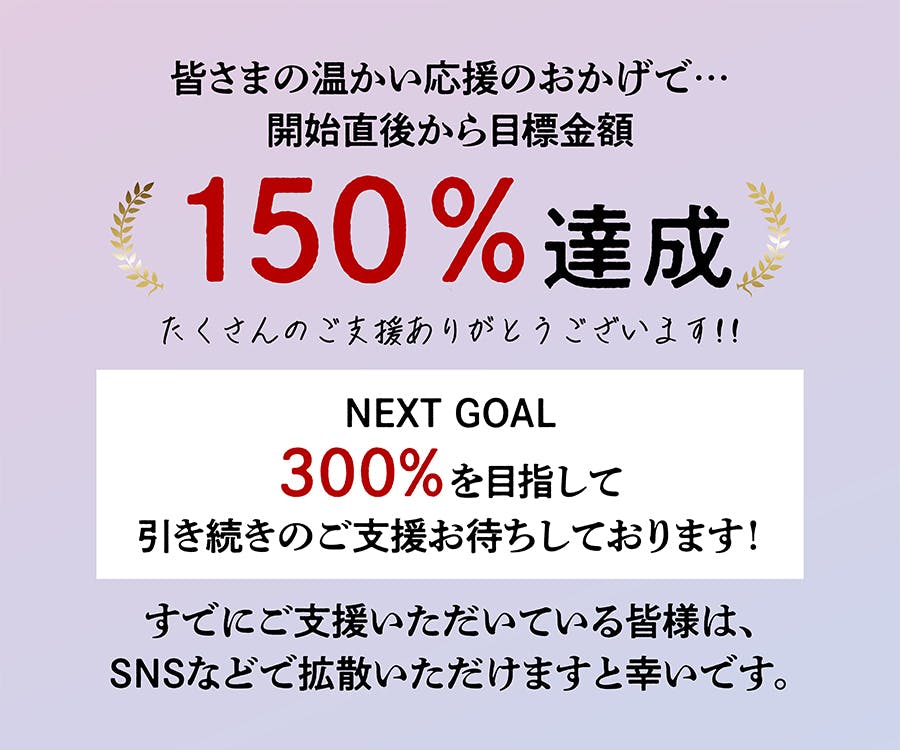 2025/02/01 14:38ご支援頂いた皆様、無事クラウドファンディングが終了しました。改めてご支援に感謝申し上げます。リターンは紹介ページにもあります通り、2025年3月にお届け予定です。発送後に改めてこちらのメッセージにて、発送の旨ご報告申し上げます。今後も様々なプロジェクトを企画して参りますので、またご縁ありましたら、よろしくお願い申し上げます。 もっと見る【お礼】開始直後から目標金額達成!!