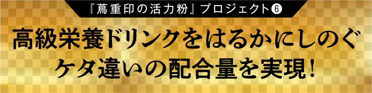 まずは試した方が明らかな違いを感じられるよう、1袋あたりなんと「黄精」40,000mgというケタ違いの配合量を実現! 高級栄養ドリンクでもごくわずか、それも主に中国産原料が一般的であるのに対し、当プロジェクト限定の希少な国産ナルコユリ原料をまるごと100%使用しているにも関わらずです。
