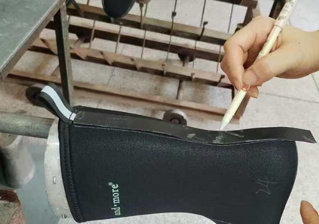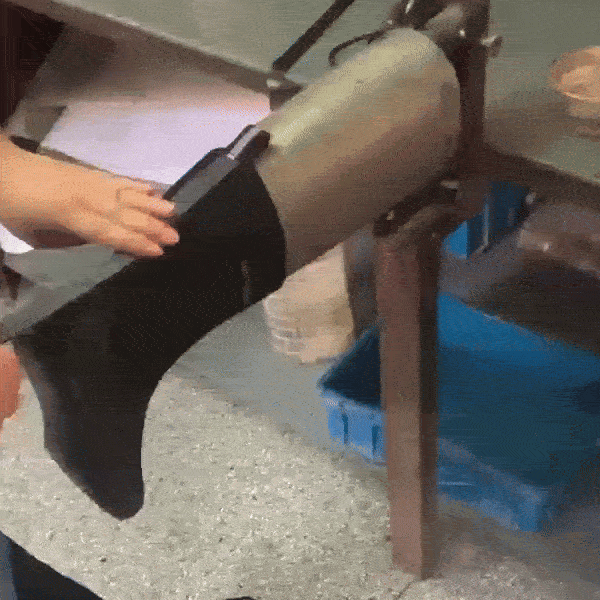 100℃を超える加硫窯で圧力を加え靴底とアッパーを圧着します