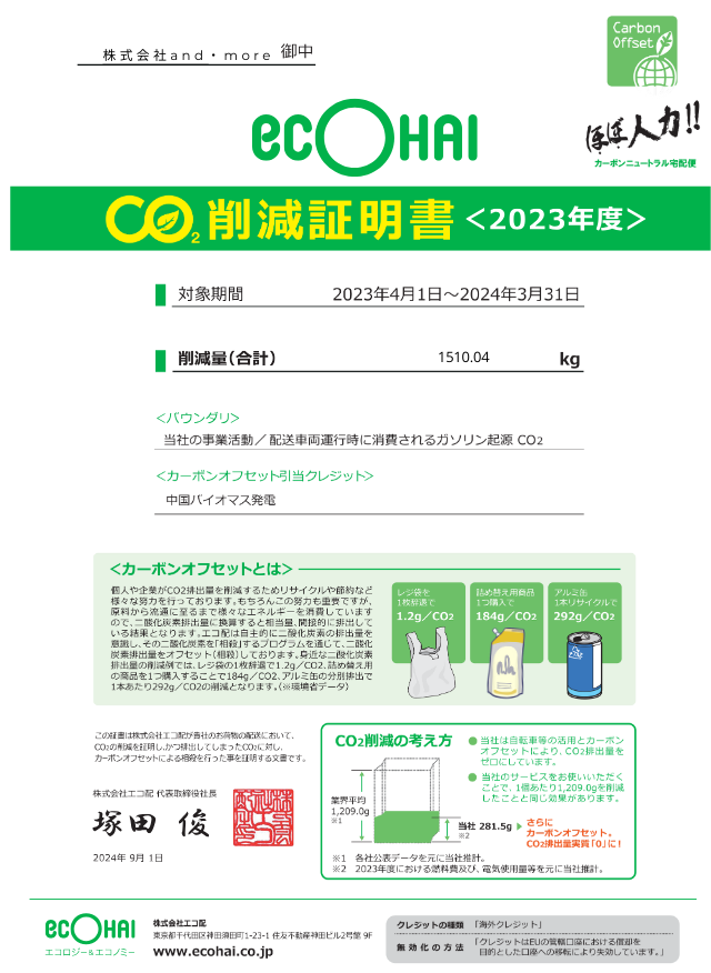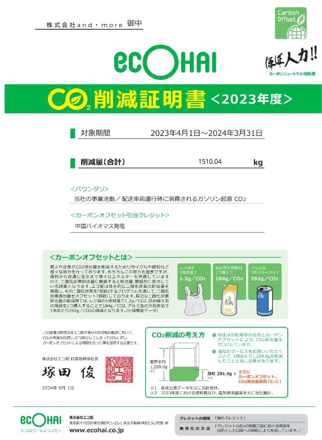 「エコ配」とはCO2排出量実質「0」の宅配便主たる配送手段に自転車を活用し、自動車を持たざるを得ないエリアについては、カーボン・オフセット・クレジットの購入により、温暖化ガスの排出枠を購入し、排出されるCO2の量を事実上ゼロとする、環境にやさしい配送業者です