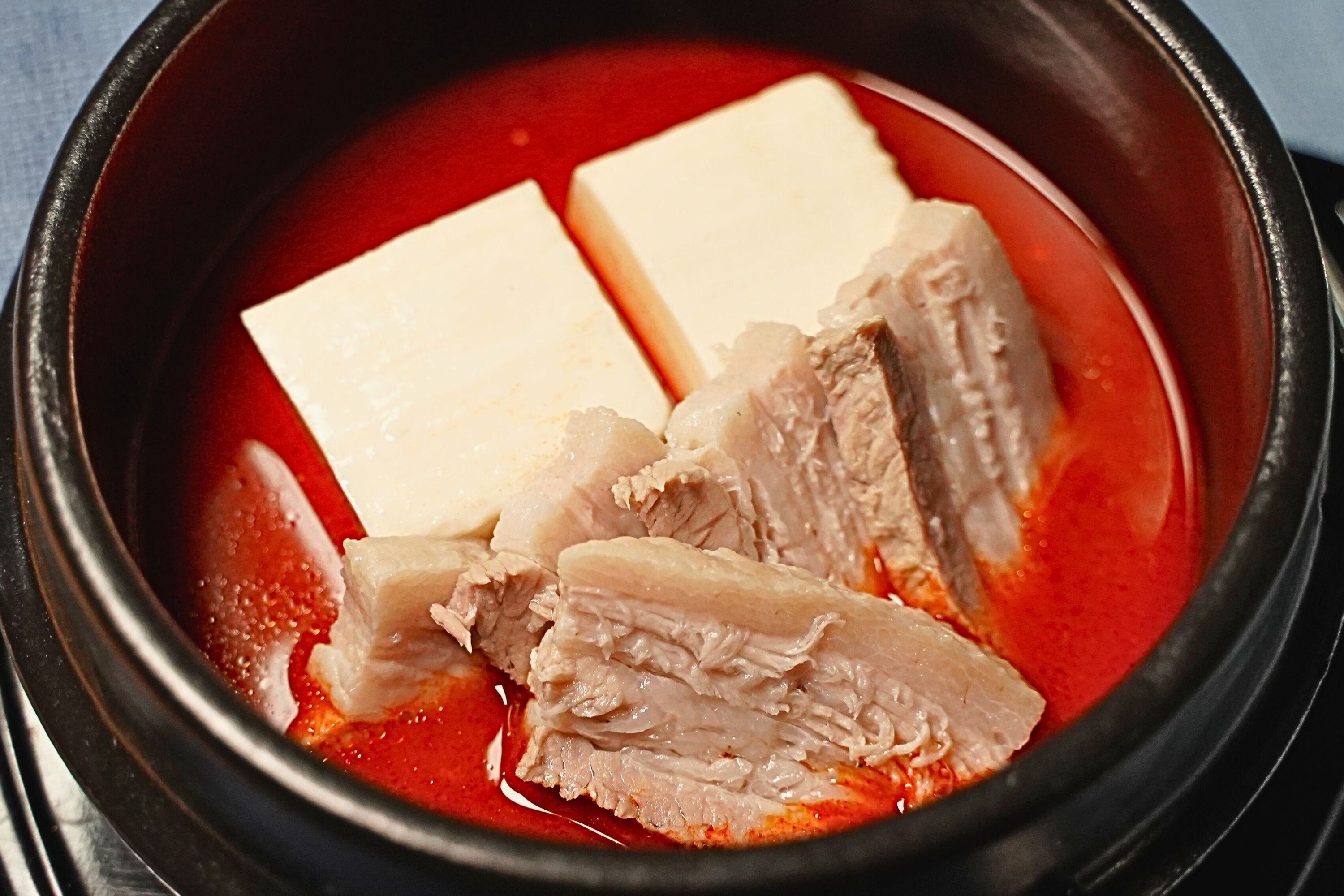 水キムチに負けず劣らずこだわり抜いたチゲスープは、コクのある辛味にほんのりとした甘味がうっすらまとわりつく、心地よい味のハーモニーを作り出し、絶品のスープに仕上がったと自負しております。