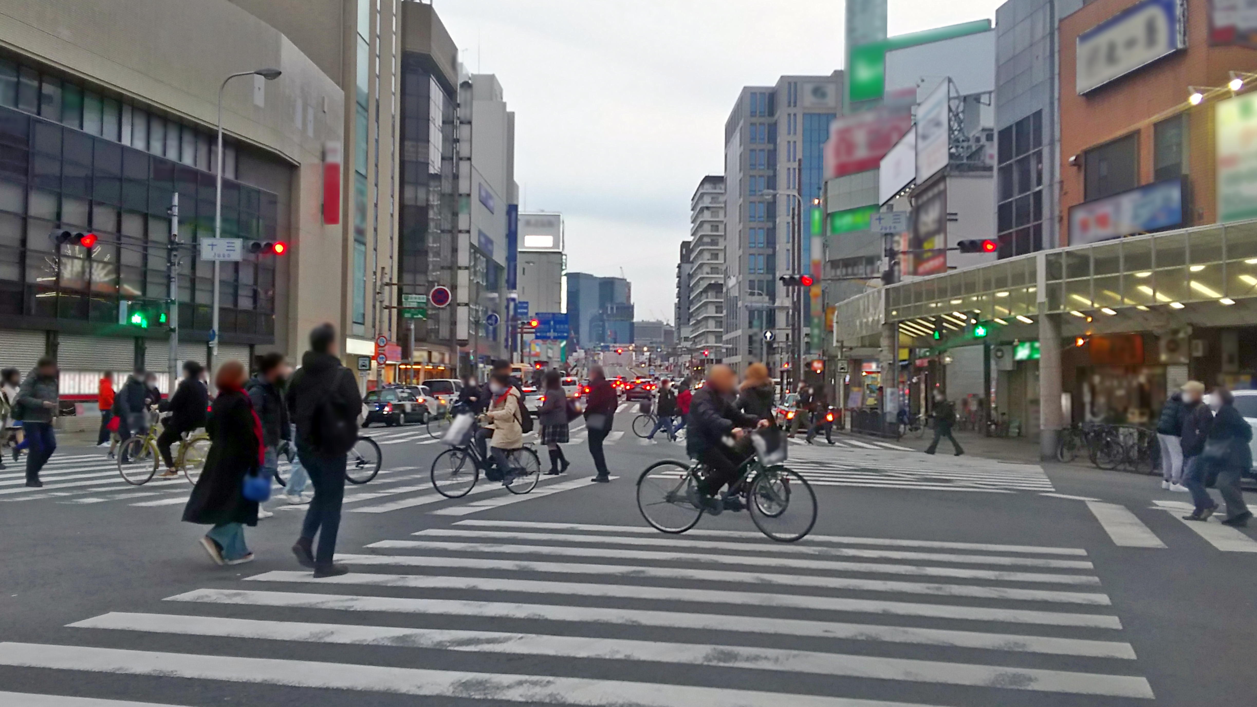 多くの人が行き交う大阪十三のスクランブル交差点