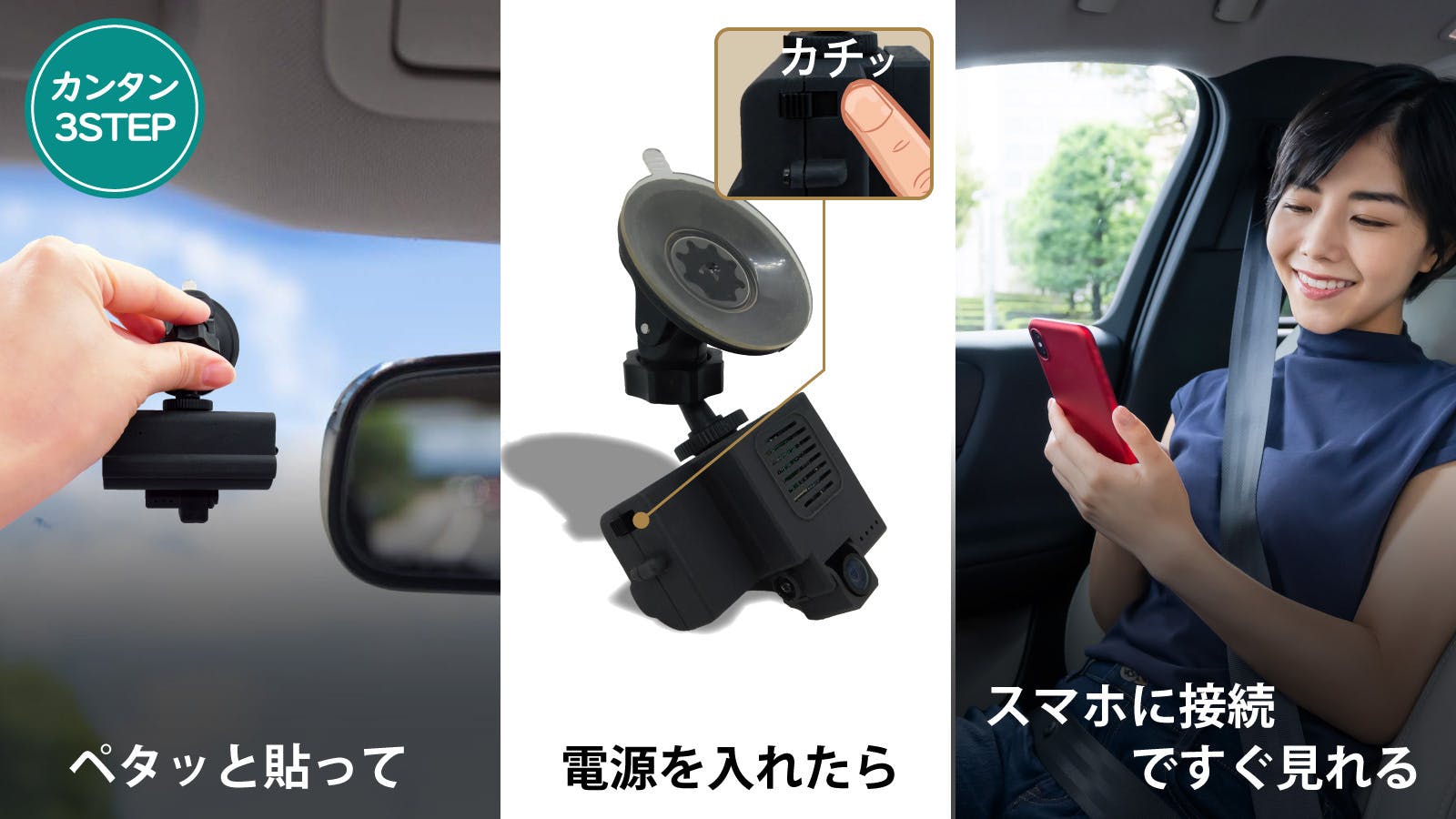 フロントガラスにドラレコを貼り付け、電源を入れ、スマホに接続するだけ!