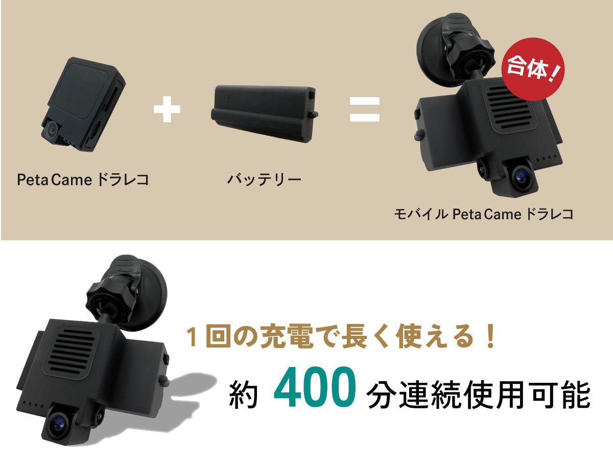 本製品は有線だった「Peta Cameドライブレコーダー」にバッテリーを搭載した新モデル。